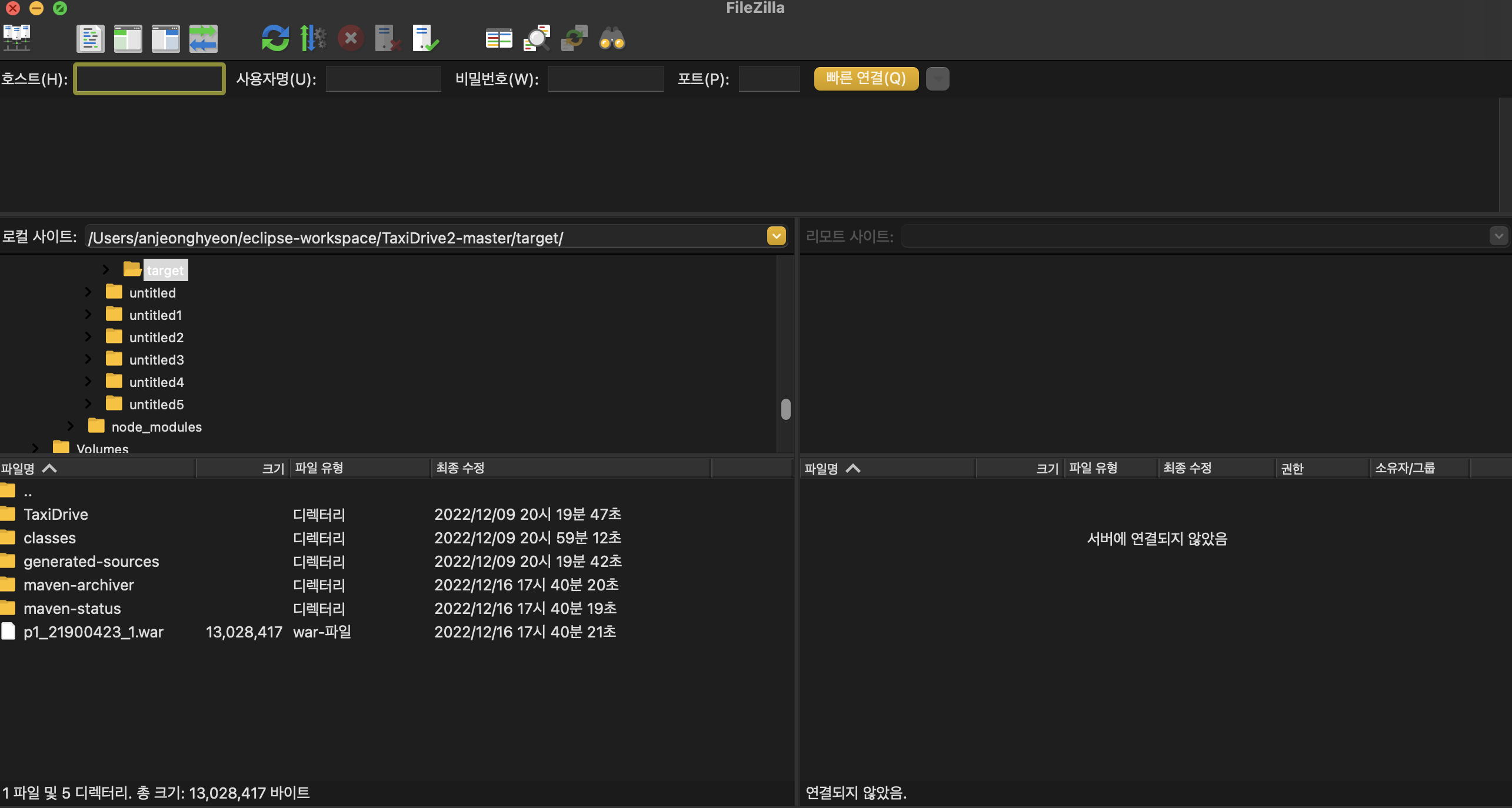 파일질라를 열면 위의 사진처럼 열리는데 맨 위에 호스트, 사용자명, 비밀번호, 포트를 입력해야 사용이 가능하다.