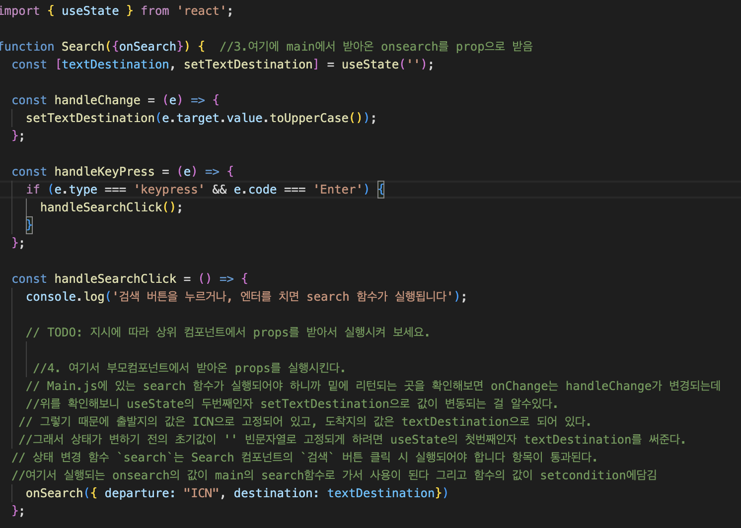 search함수를 Search.js로 보낸후 검색된 departure, destination 의 값을 search안에서 실행한다 departure의 초기값은 icn이고 destination은 아직 값이 없는 걸 주의하자