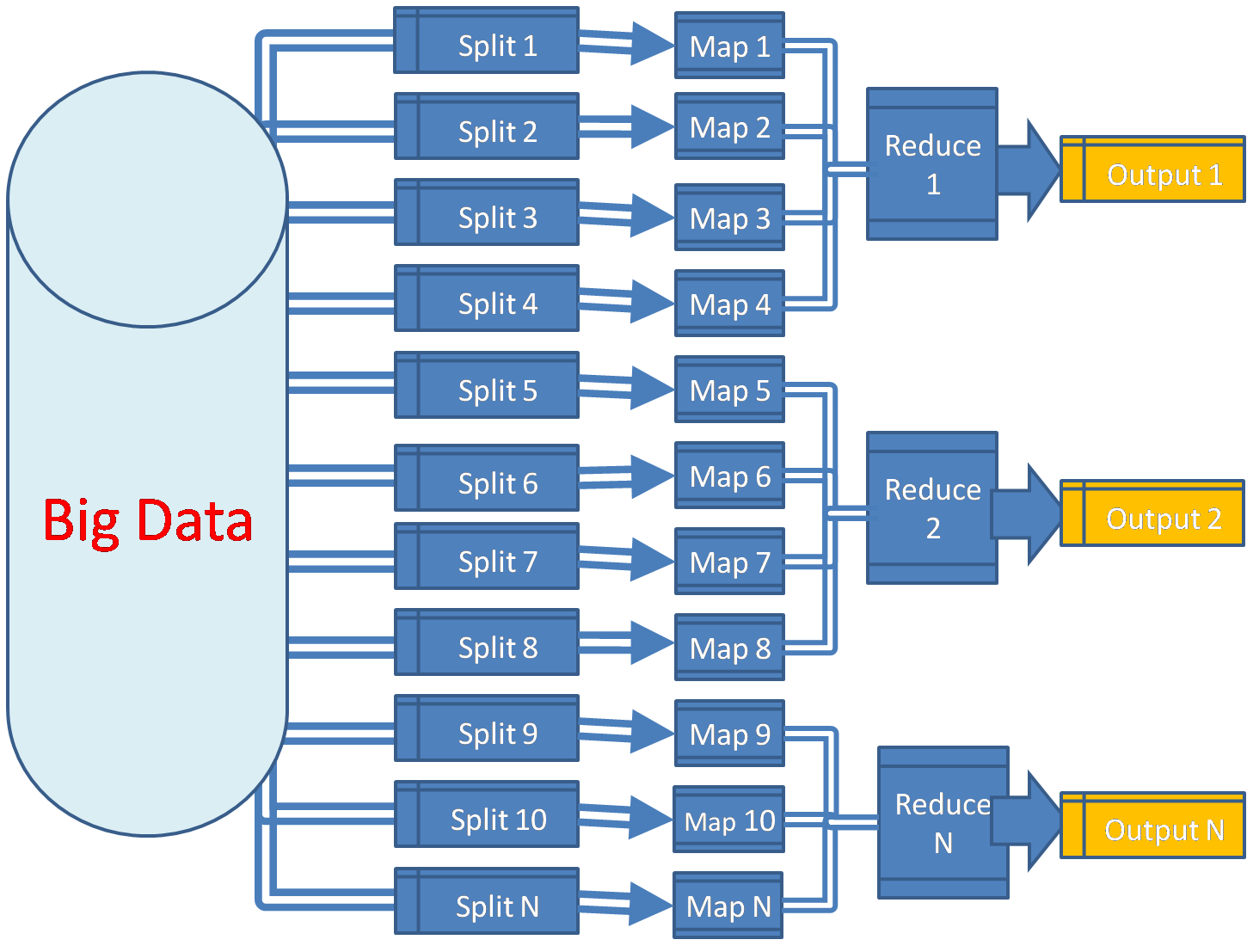 - 1억 건의 로그 파일을 HDFS에서 여러 노드가 병렬로 나누어 읽습니다.