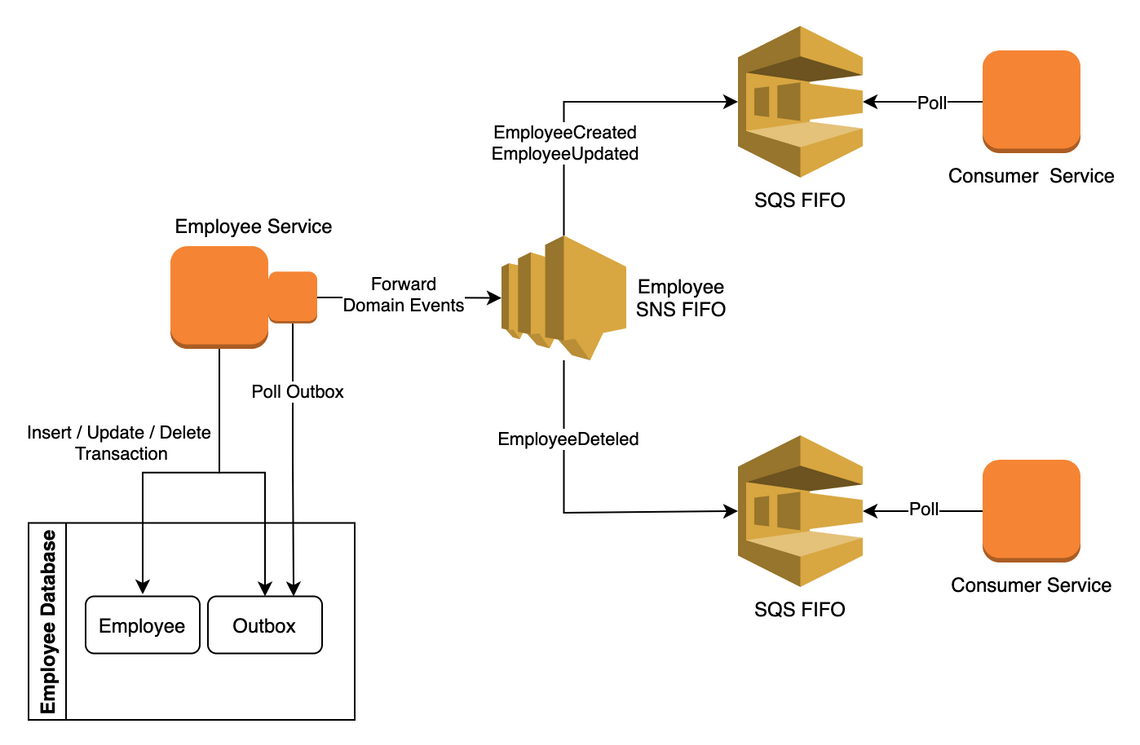 비즈니스 테이블 수정과 동시에 Outbox 테이블에 발행할 이벤트 레코드를 INSERT