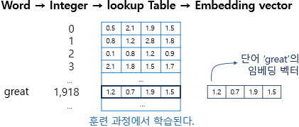 위의 사진에서 great이라는 단어의 id는 1918이고, 임베딩은 해당행의 (1.2, 0.7, 1.9, 1.5)입니다.