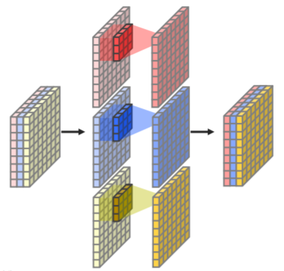 채널이 여러개면 필터의 채널도 여러개로 해서 한꺼번에 계산하는 것이 아니라 채널별로 따로 conv하고(depthwise) 각 채녈합친후 1x1 conv를 한다(pointwise)
