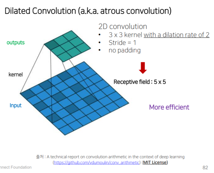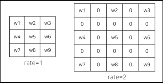 dilated convolution은 filter 중간에 0을 넣어 parameter수는 같지만 필터의 크기가 커진다.