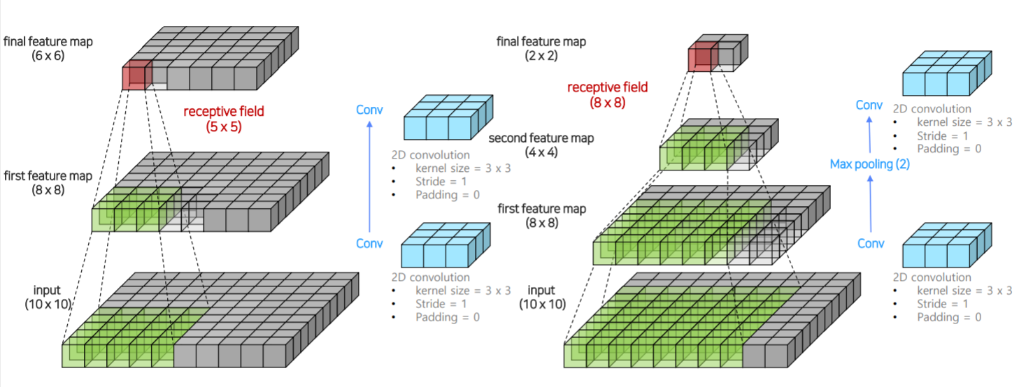 max pooling으로 더 넓직넓직하게 정보를 훑게되고 이는 더 넓은 receptive field를 가지게 만들어줌.