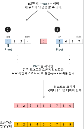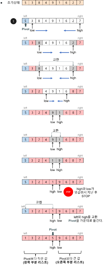 ↳ 피벗값과 중복되는 값을 좌/우 영역에서 제외시킴으로서 시간복잡도를 개선