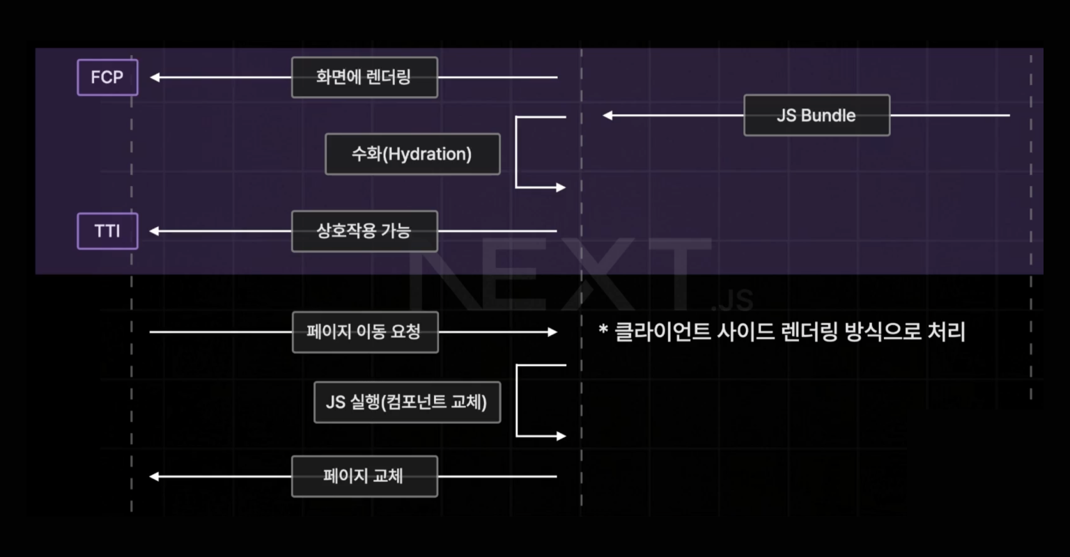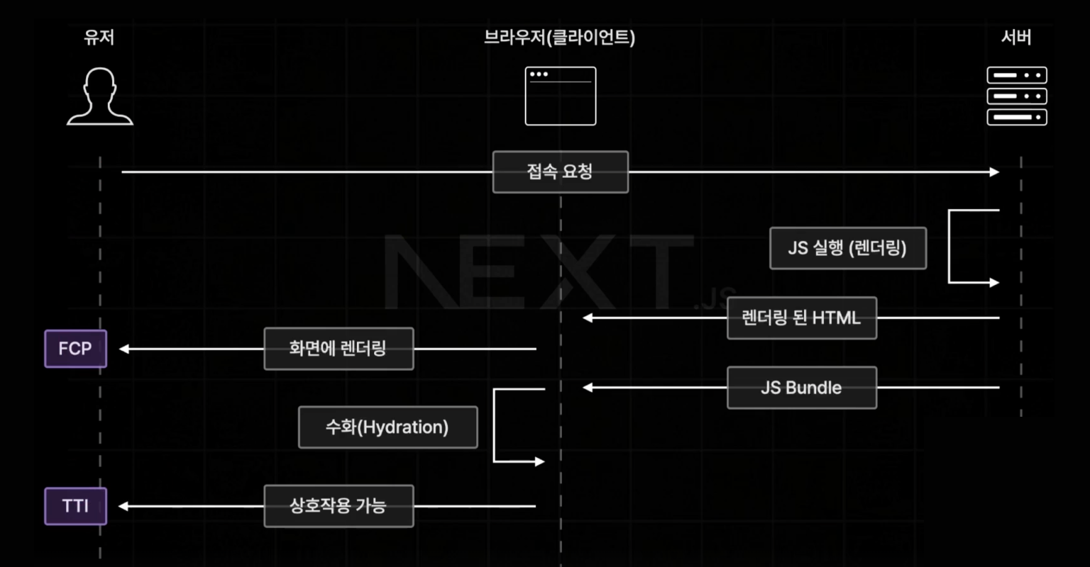 - 그렇기 때문에 FCP 직후 서버는 JS를 번들을 브라우저에 전달해서 나머지 컴포넌트들을 클라이언트 사이드에서 실행할 준비를 마칩니다.