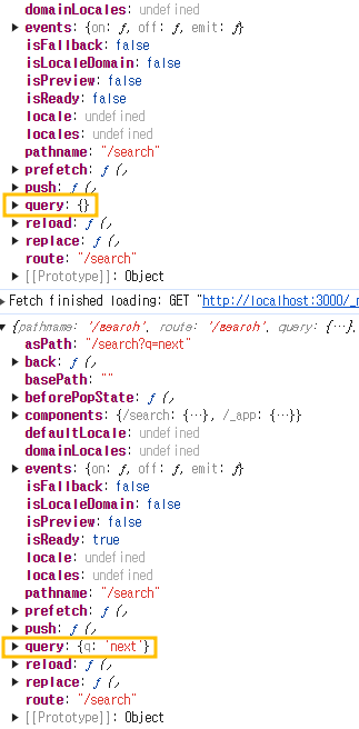 - 따라서 첫 번째 출력에서는 쿼리 스트링을 인식하지 못했다가 두 번째에 인식합니다.