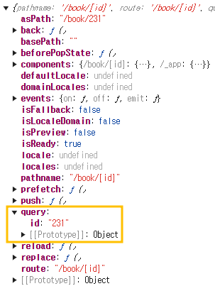 [id].tsx, 즉 파라미터 키를 id로 지정했기 때문에 id: 231이라고 출력됩니다.