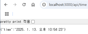 - 이제 time이라는 API가 호출되면 → 핸들러 함수가 실행되고 → 이 함수에서는 date라는 새로운 객체를 만들고 → response의 응답 값으로 json 객체를 사용하게 됩니다.