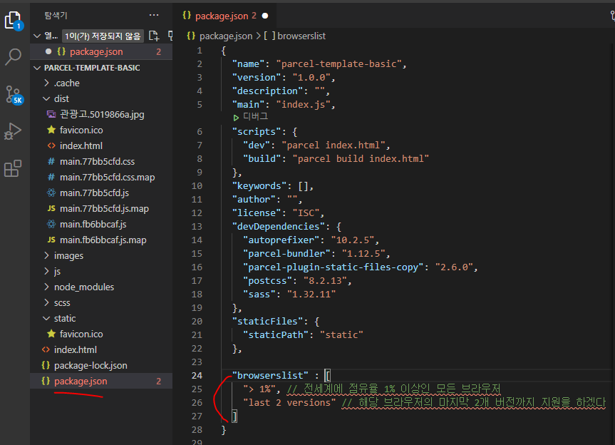 - browserslist 옵션은 현재 NPM 프로젝트에서 지원할 브라우저의 범위를 명시할 용도