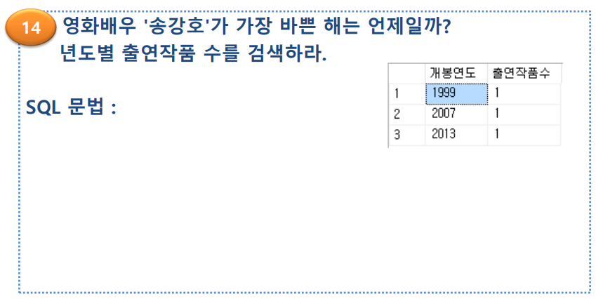 -14. 영화배우 '송강호'가 가장 바쁜 해는 언제일까? 년도별 출연작품 수를 검색하라