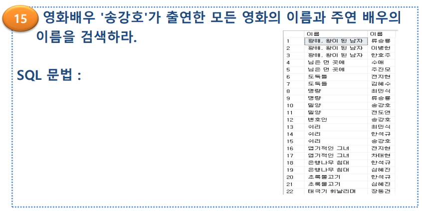 -15. 영화배우 '송강호'가 출연한 모든 영화의 이름과 주연 배우의 이름을 검색하라