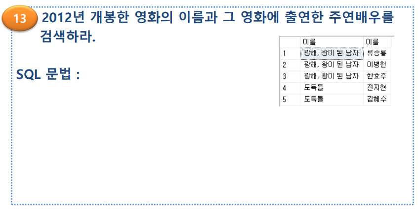 SELECT 영화.이름, 배우.이름 FROM 영화, 배우, 출연