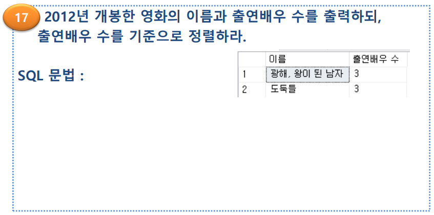 -17.2012년 개봉한 영화의 이름과 출연배우 수를 출력하되, 출연배우 수를 기준으로 정렬하라