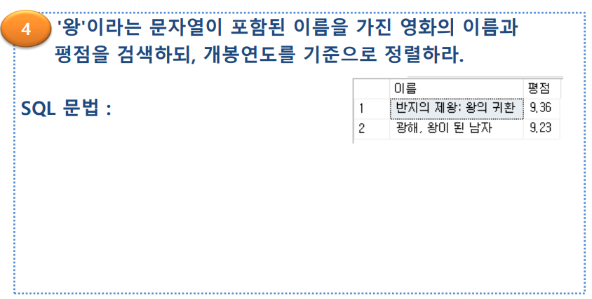 -4. '왕'이라는 문자열이 포함된 이름을 가진 영화의 이름과 평점을 검색하되, 개봉연도를 기준으로 정렬하라
