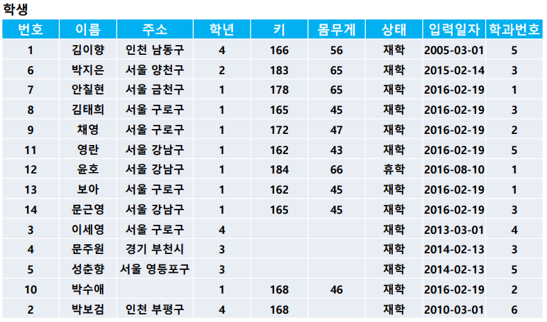 INSERT INTO 학생(번호,이름,주소,학년,키,상태,입력일자,학과번호)