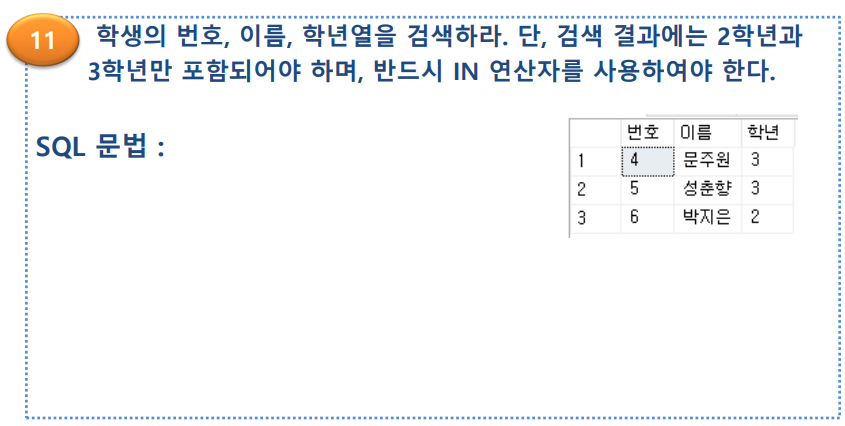 -11. 학생의 번호, 이름, 학년열을 검색하라(단, 검색결과에는 2학년과 3학년만 포함되어야 하며, 반드시 IN 연산자를 사용하여야 한다)