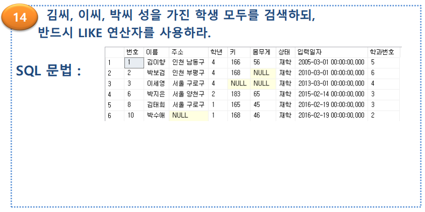 -14. 김씨, 이씨, 박씨 성을 가진 학생 모두를 검색하되 반드시 LIKE 연산자를 사용하라