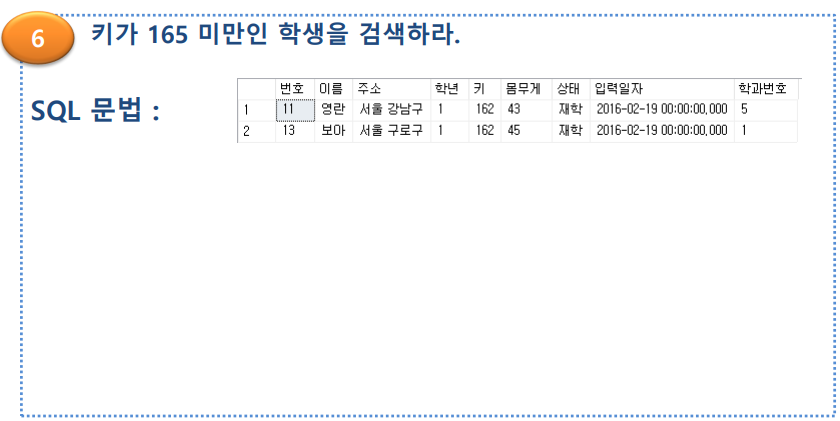 VALUES(6, '박지은', '서울양천구', 2, 183, 65, '재학', '2015-02-14',3);