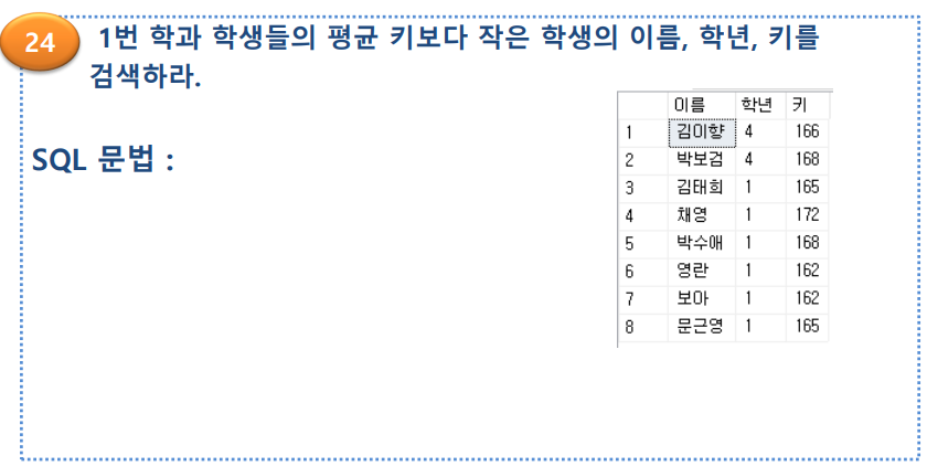 -24. 1번 학과 학생들의 평균 키보다 작은 학생의 이름, 학년, 키를 검색하라