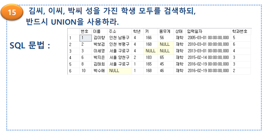 -15. 김씨, 이씨, 박씨 성을 가진 학생 모두를 검색하되 반드시 UNION을 사용하라