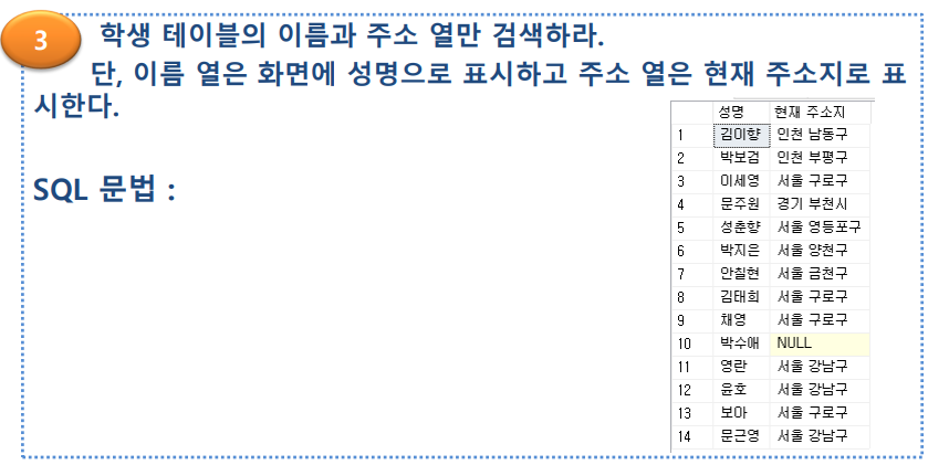 -3. 학생 테이블의 이름과 주소 열만 검색하라(단, 이름 열은 화면에 성명으로 표시하고 주소 열은 현재 주소지로 표시한다)