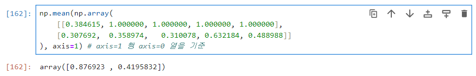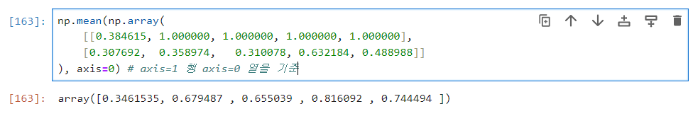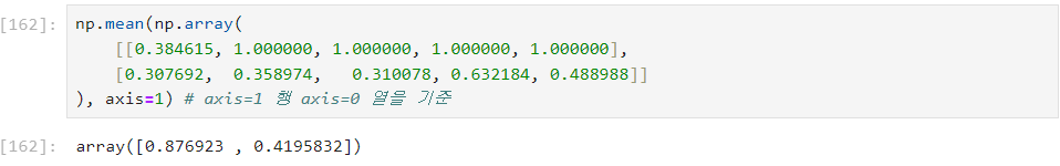 np.mean은 주어진 데이터의 평균을 계산하는 NumPy 함수 이 함수는 배열 또는 순차 데이터를 받아서 그들의 평균값을 계산
