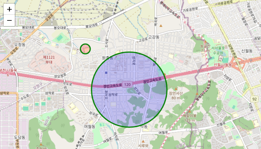 folium.Circle() = 지도 위에 원을 그리고 원의 특성을 설정하는 데 사용