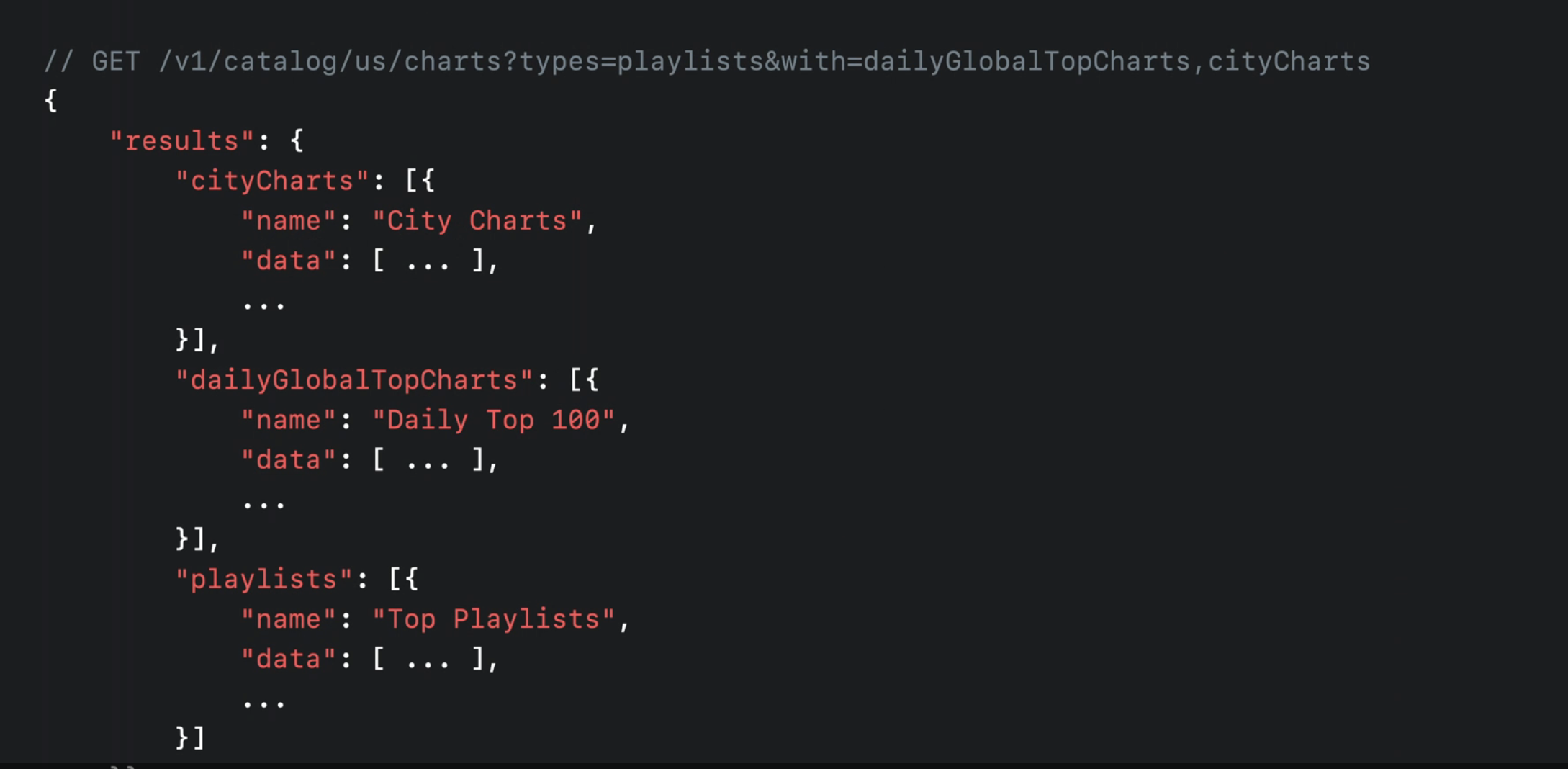 사용자는 이러한 차트 재생 목록을 라이브러리에 추가하면 자동으로 업데이트됩니다. 이제 /charts 엔드포인트에서 type=playlists를 지정하고 with 쿼리 매개변수를 사용하여 원하는 세트(dailyGlobalTopCharts, cityCharts 또는 둘 다)를 지정하여 직접 가져올 수 있습니다.