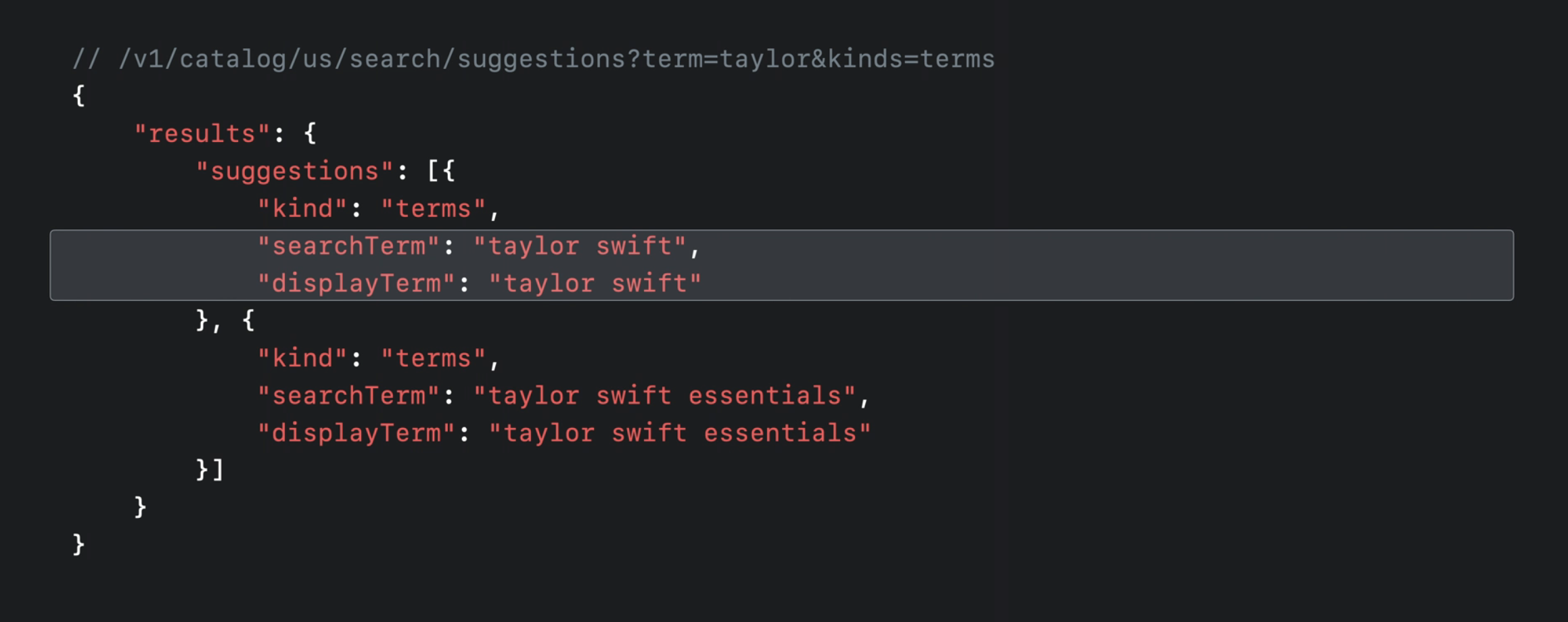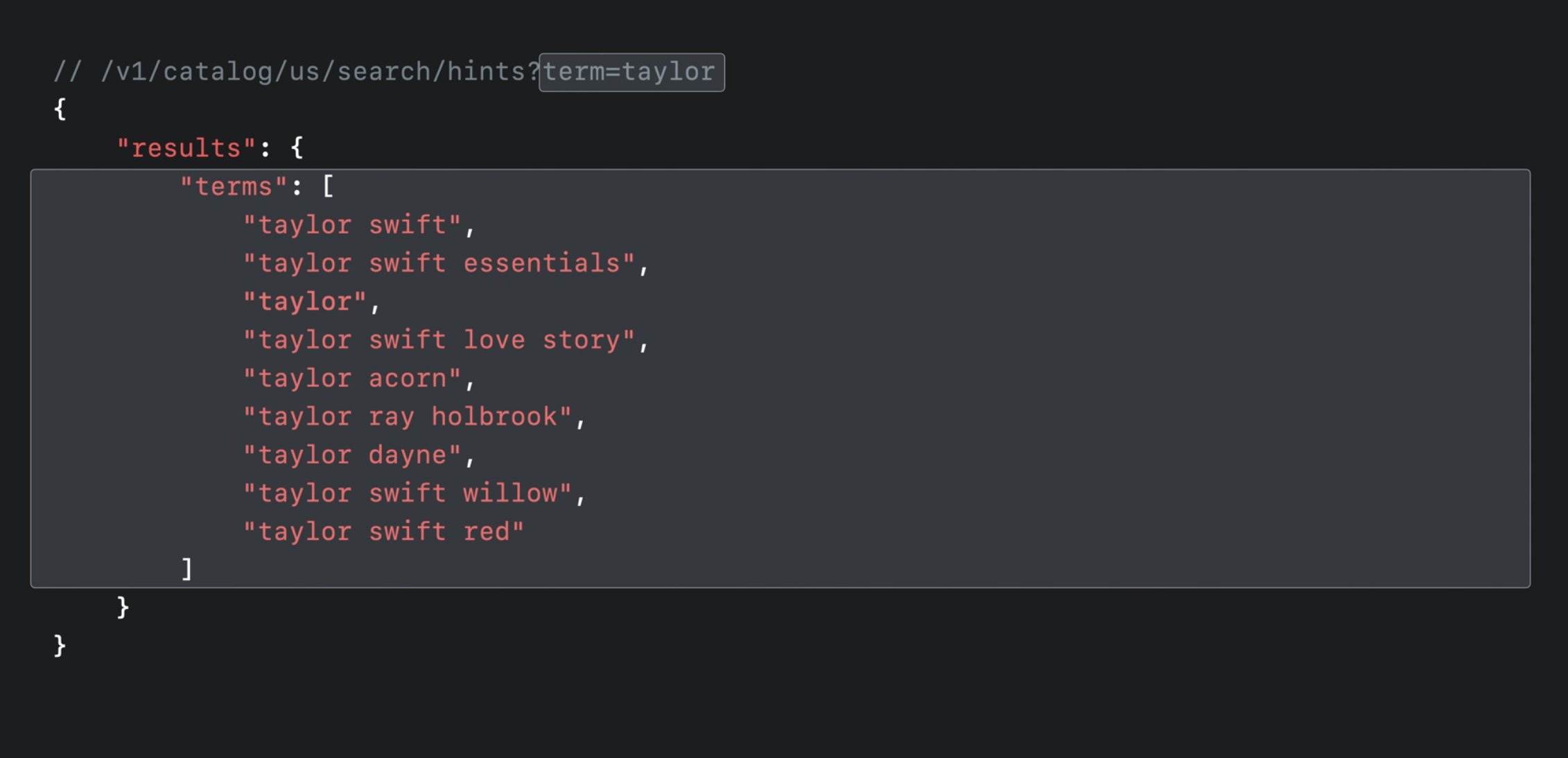 몇 가지 검색 개선 사항을 살펴보기 전에 현재의 /search/hints 엔드포인트를 간략히 요약해 보겠습니다. 이미 이 엔드포인트를 사용해 추천 검색어 목록을 가져오고 계실 수도 있습니다. 예를 들어, 다음은 taylor라는 검색어에 대해 얻을 수 있는 몇 가지 결과입니다.