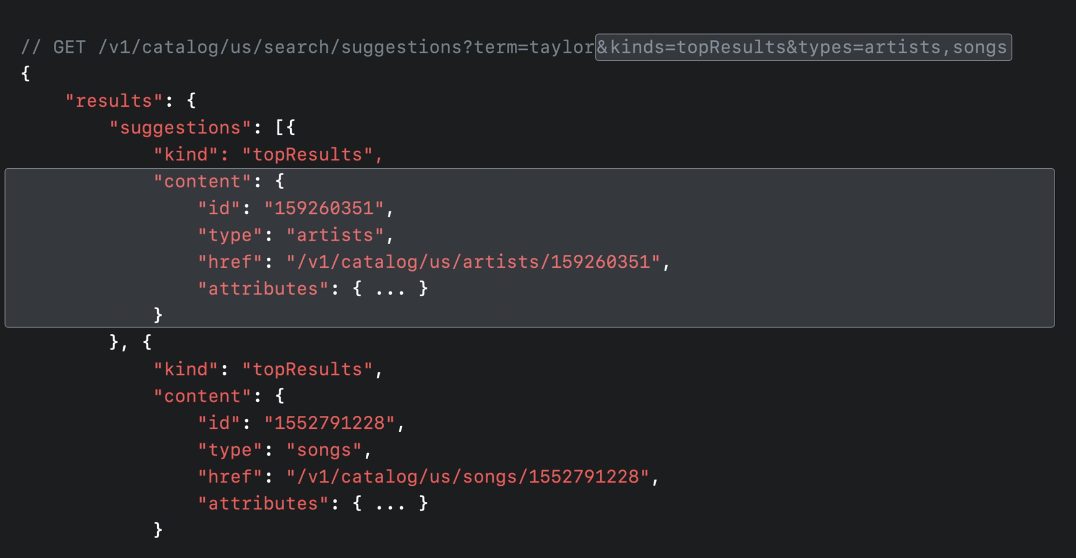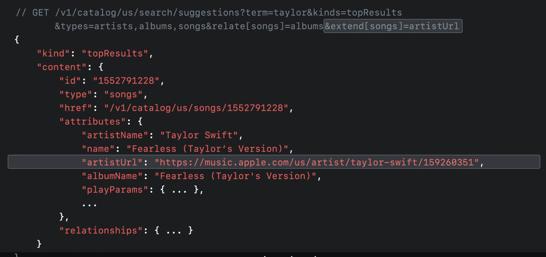 /suggestinos 요청을 기반으로 노래 결과에 대해 사용자가 Apple 음악에서 해당 아티스트의 페이지로 연결할 수 있는 기능도 허용하고 싶다고 결정할 수 있습니다. 이렇게 하려면 요청에 extend[songs]=artistUrl을 추가하기만 하면 됩니다.
