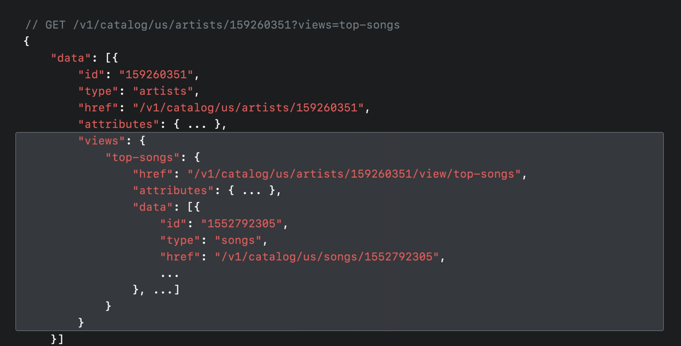 이 응답에는 아티스트 리소스에 인기곡 보기를 포함시키는 예가 나와 있습니다. 다른 예로는 인기 뮤직 비디오 또는 아티스트의 싱글이 있습니다. 물론 특정 리소스 유형에 대해 지원되는 보기의 전체 목록은 공식 Apple 음악 API 문서에서 확인할 수 있습니다.