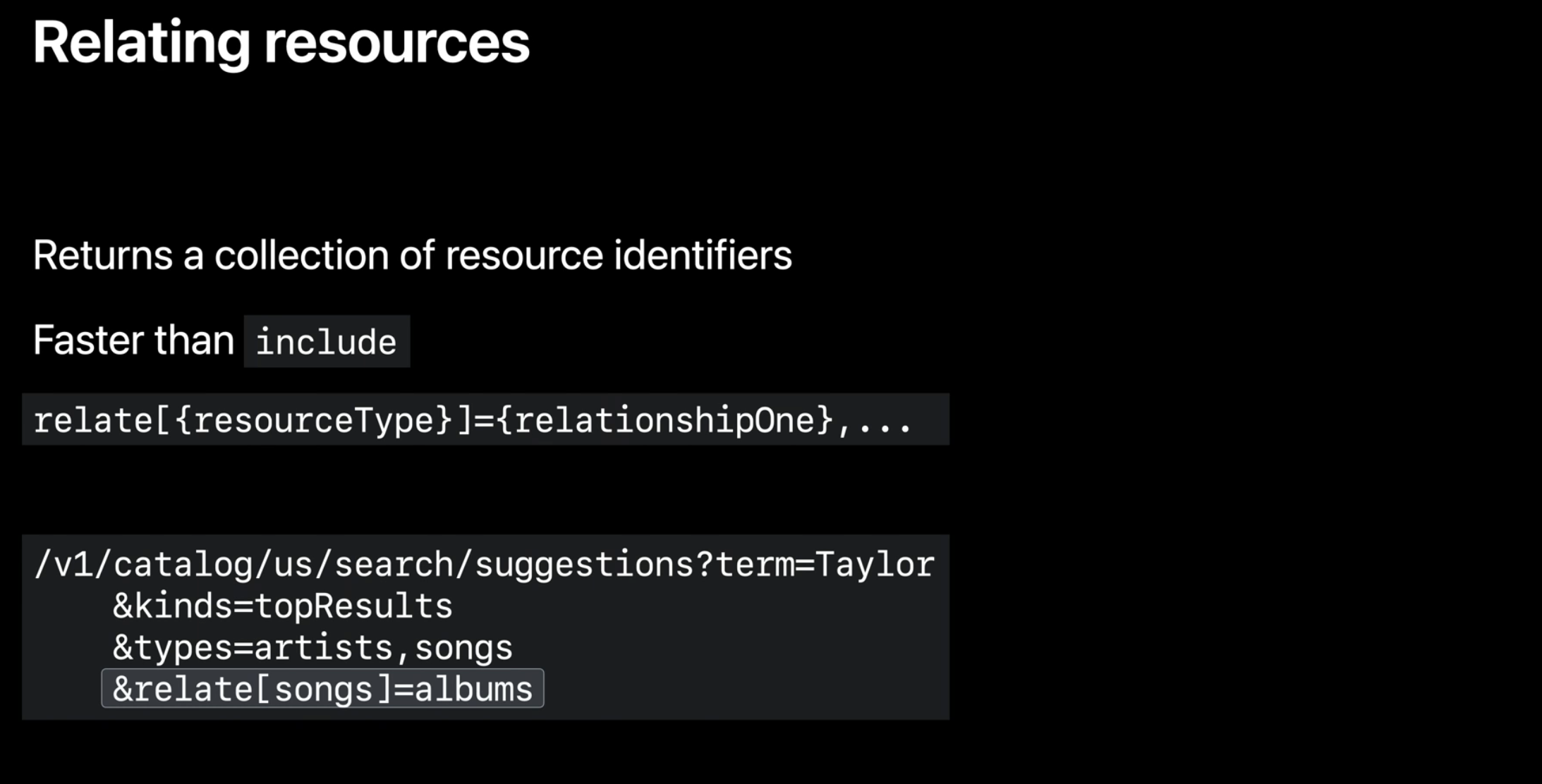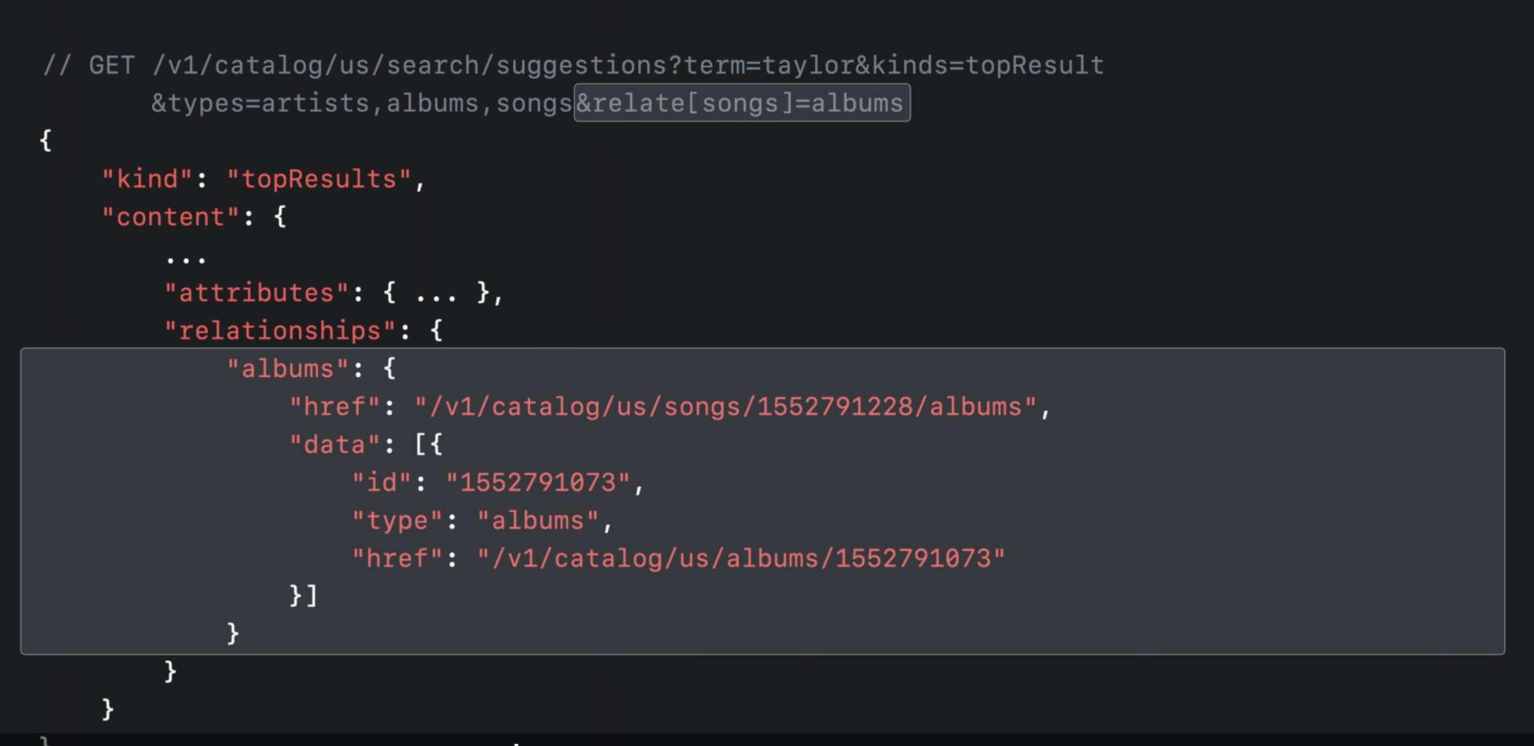예를 들어 /search/suggestions 엔드포인트에서 사용자가 노래 결과를 선택하면 해당 노래의 앨범 페이지로 이동하고 싶다고 결정할 수 있습니다. 이 경우 해당 노래의 앨범에 대한 href만 있으면 해당 페이지로 이동할 수 있으므로 relat[songs]e=albums 을 지정하여 해당 데이터를 가져올 수 있습니다.