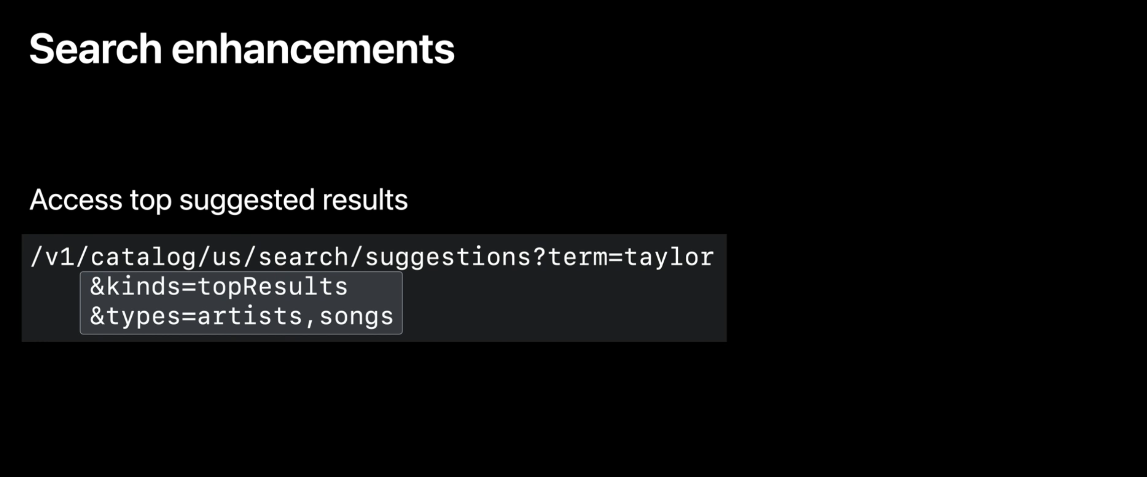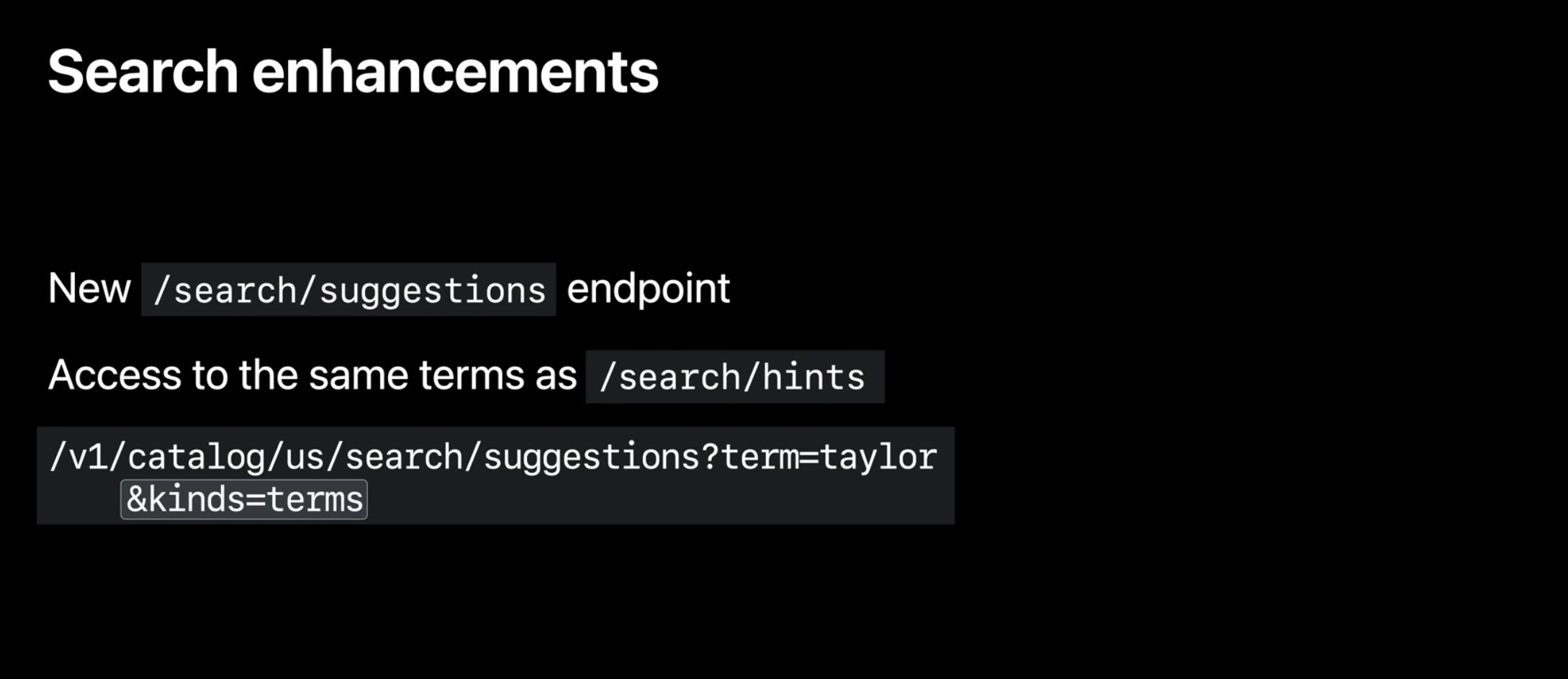오늘은 /search/hints 엔드포인트를 대체하는 /search/suggestions 엔드포인트를 소개합니다. 이 엔드포인트는 /search/hints 엔드포인트와 동일한 용어에 대한 액세스를 제공하며, 요청에 kinds=terms를 지정하여 이러한 용어를 계속 가져올 수 있습니다.