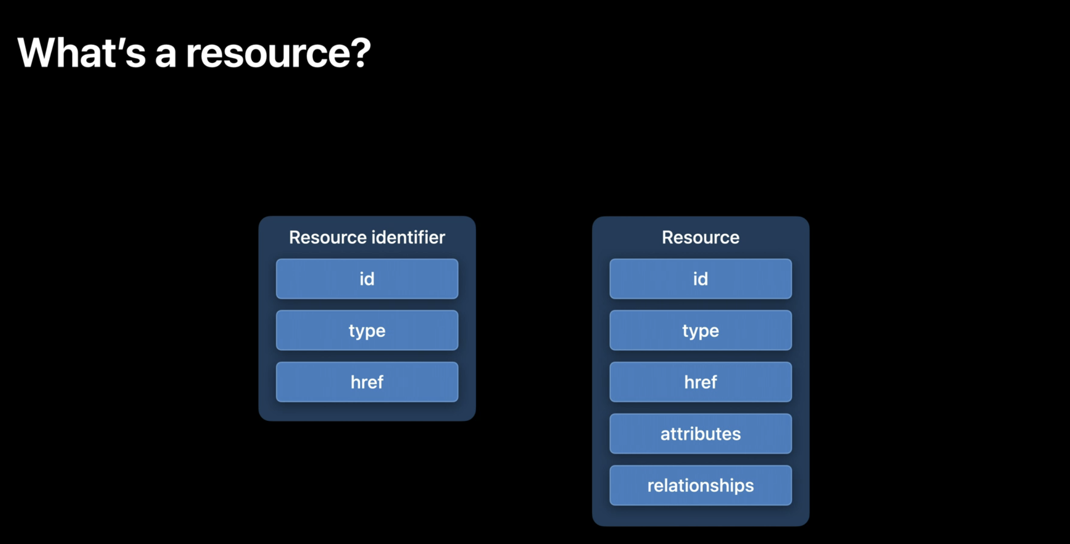 리소스를 수정하는 방법을 살펴보기 전에 리소스가 무엇인지 잘 모르시는 분들을 위해 다시 한 번 소개해 드리고자 합니다. 모든 리소스에는 API에서 리소스를 조회하기 위해 필요한 최소한의 정보인 resource identifiler 라는 것이 있습니다. 리소스 식별자에는 리소스의 id, type, href가 포함됩니다. 리소스의 전체 표현에는 이름과 같은 리소스의 attributes와 포함 매개변수를 사용하여 요청된 경우 잠재적으로 relationships도 포함됩니다. 관계는 노래의 장르나 재생 목록의 트랙과 같은 관련 리소스의 모음입니다.