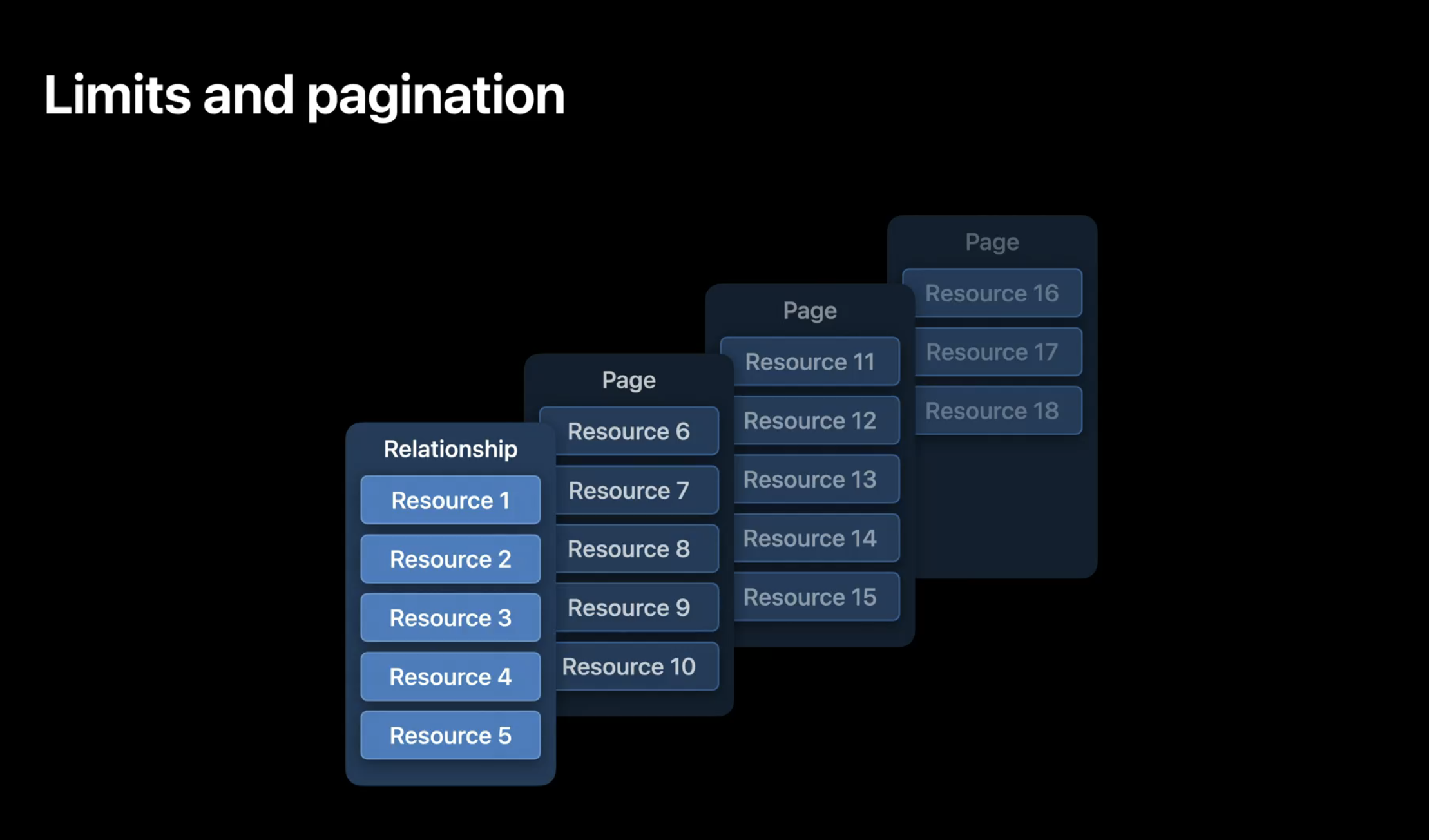 - 단일 응답에 나타나는 것보다 더 많은 관련 리소스가 있는 관계는 페이지라고 하는 여러 부분에서 가져와야 합니다.