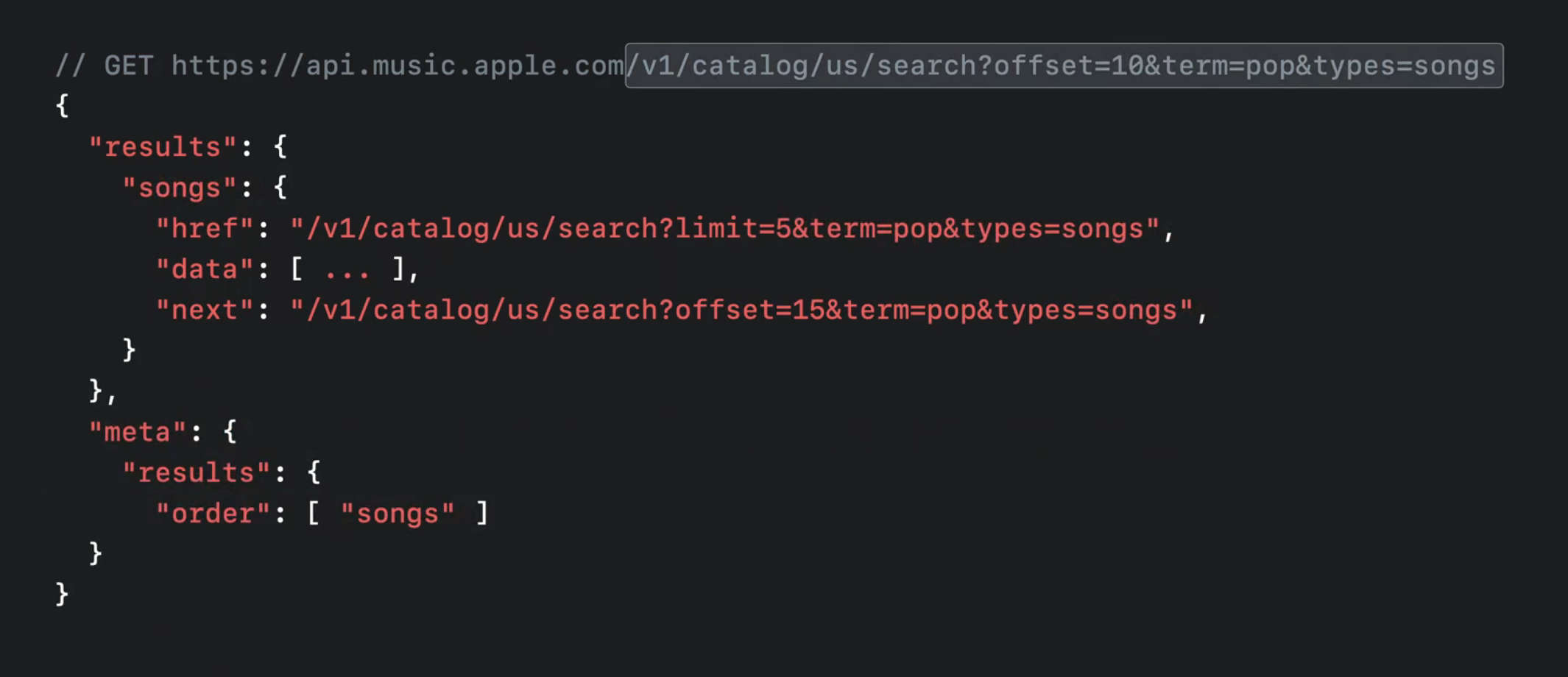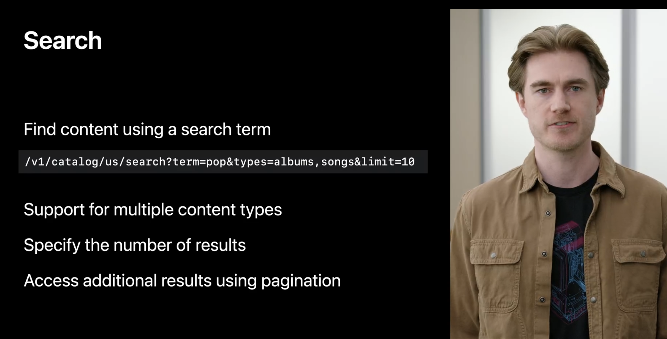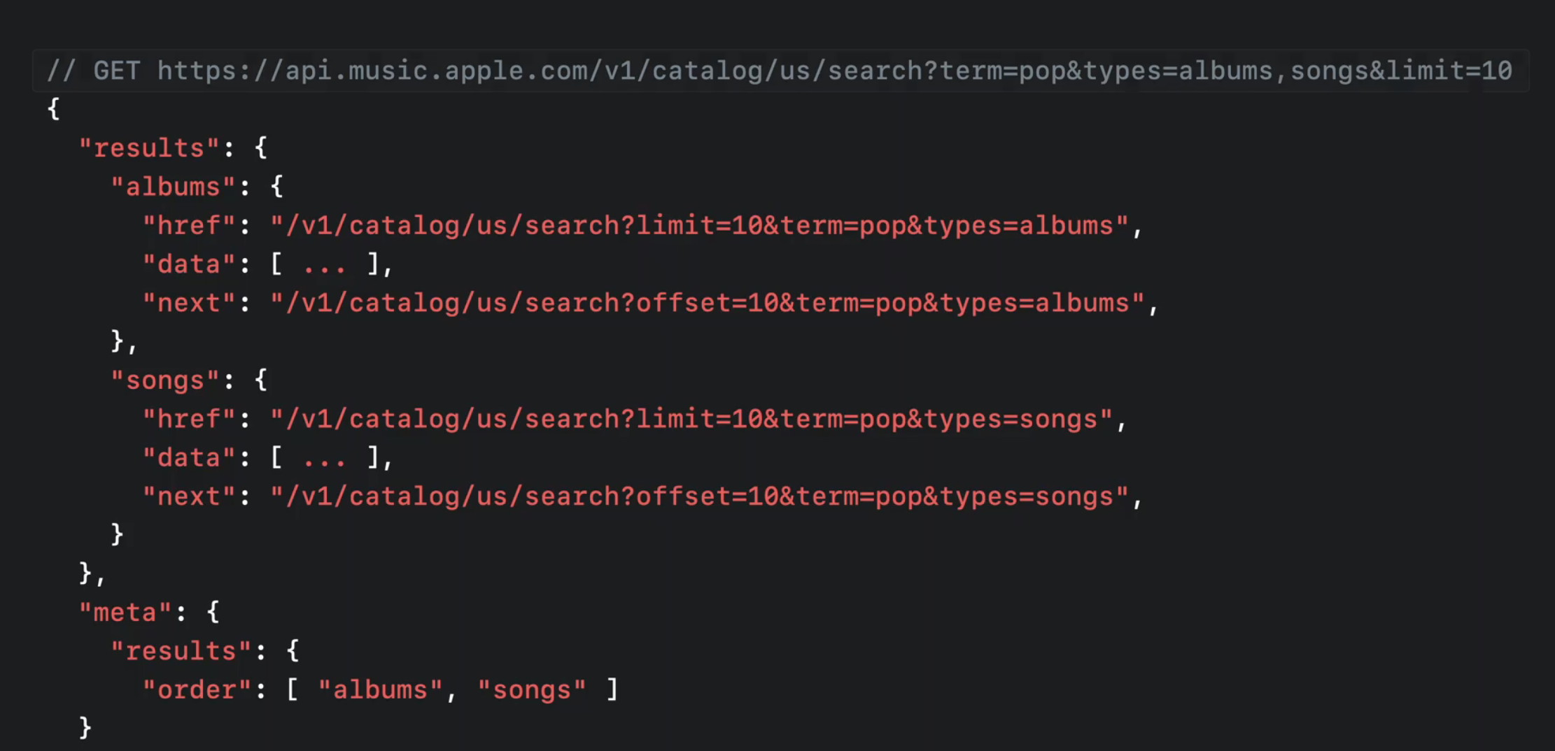 사용 가능한 API는 리소스 및 페이지네이션에 필요한 기본 지원을 통해 Apple Music에서 콘텐츠를 검색하고 접근을 위한 호출을 가속화합니다.