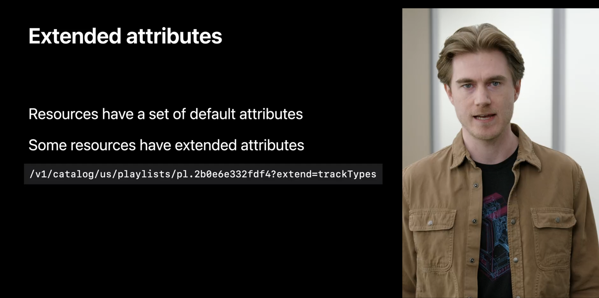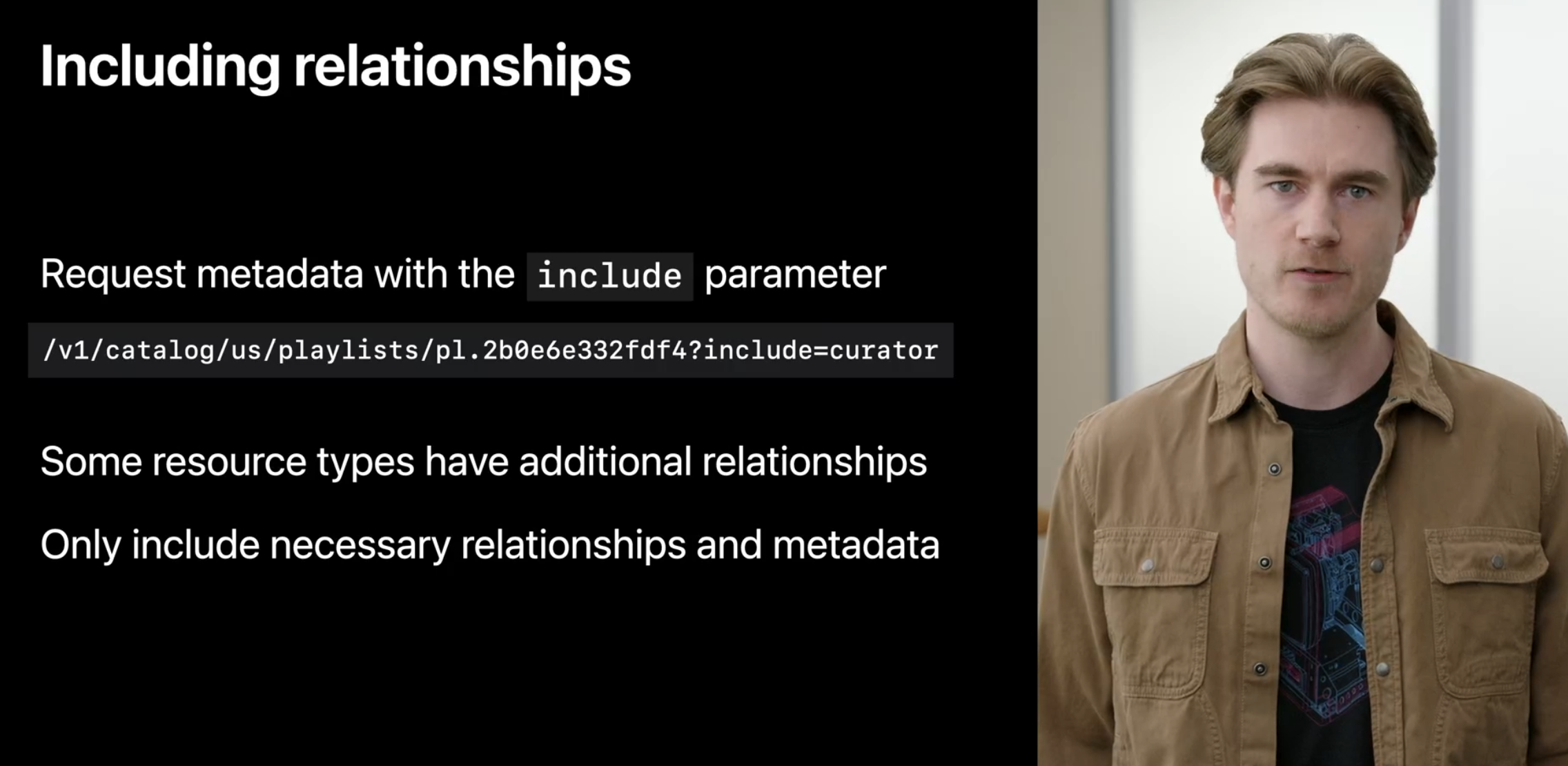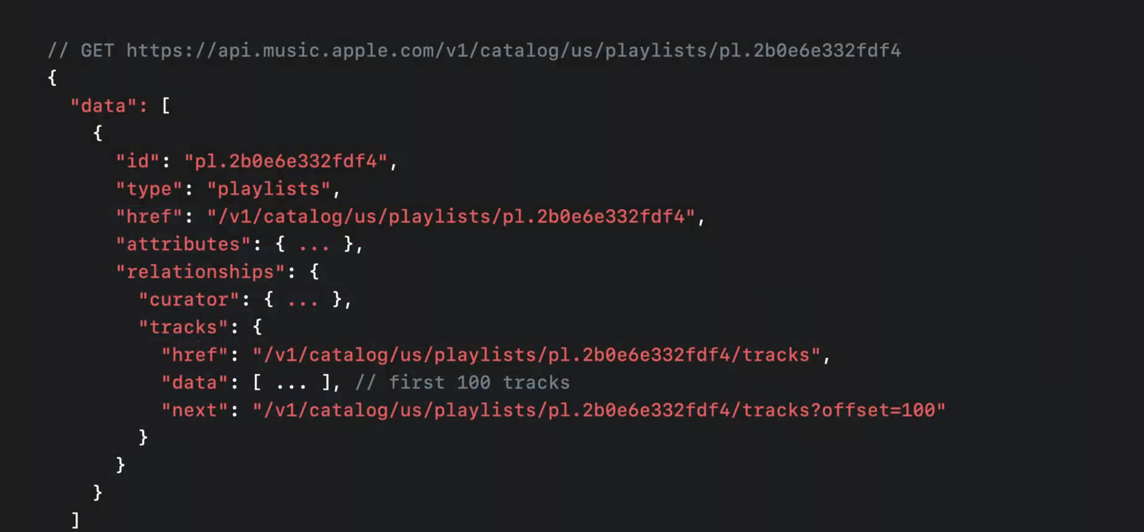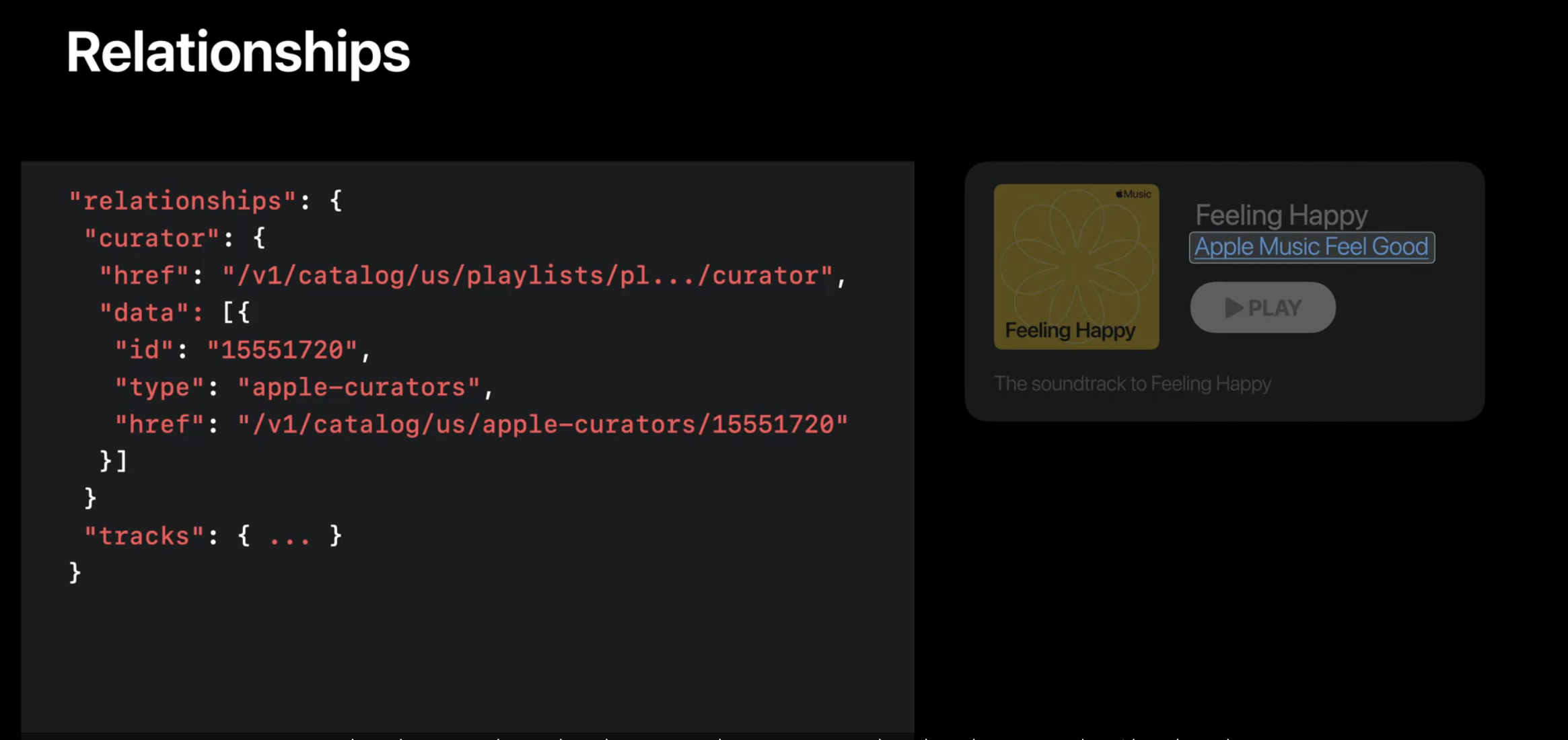 - 많은 리소스에는 일부 콘텐츠를 직접 요청할 때 반환되는 자동 관계가 있습니다. 재생 목록의 자동 관계는 큐레이터와 트랙입니다.