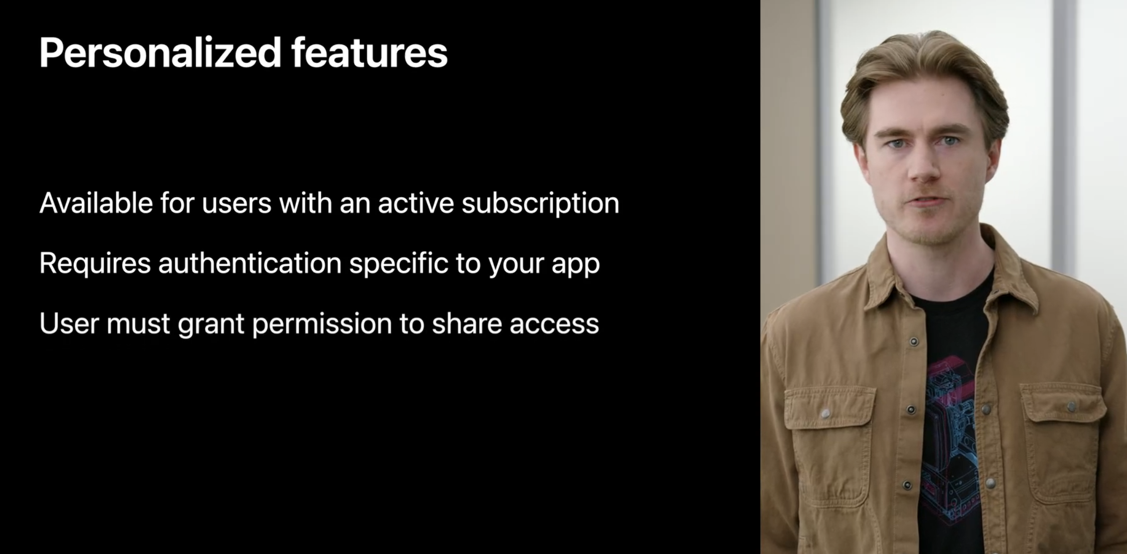 - 사용자의 동의하에 MusicKit 및 Apple Music API를 사용하여 구독자를 인증하여 사용 가능한 콘텐츠를 재생할 수 있습니다.
