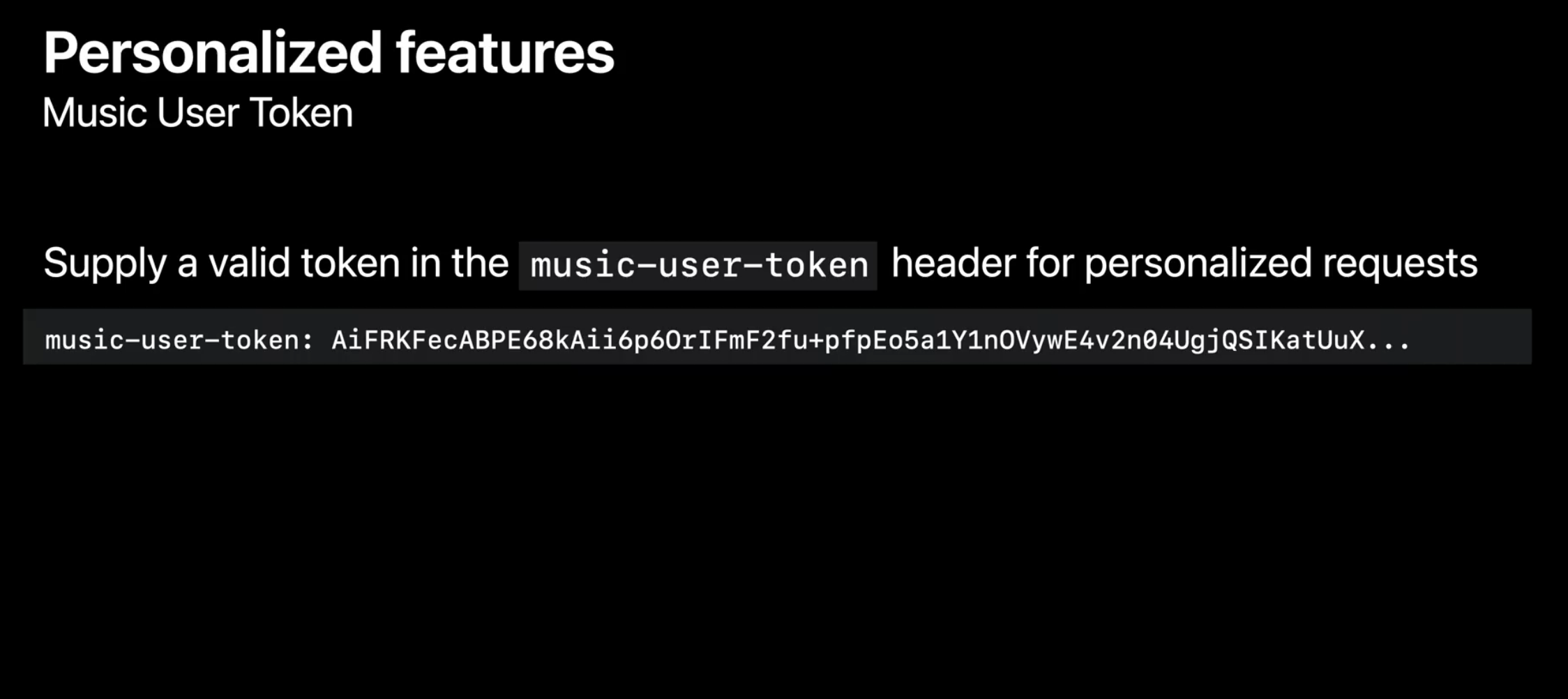 music-user-token 헤더의 Apple Music API 요청에 추가되며 개인화된 데이터에 대한 액세스를 인증하는 데 사용됩니다.