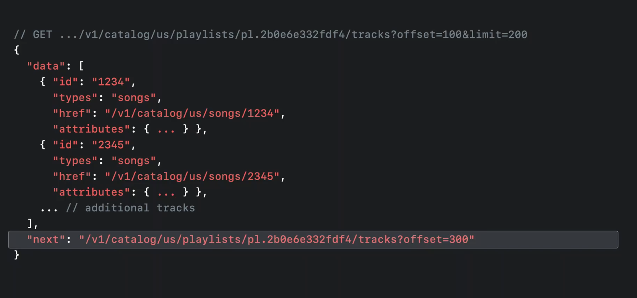 - 이 재생 목록에는 응답에 포함된 것보다 더 많은 트랙이 있으므로 다음 위치는 데이터의 형제로 나타납니다.