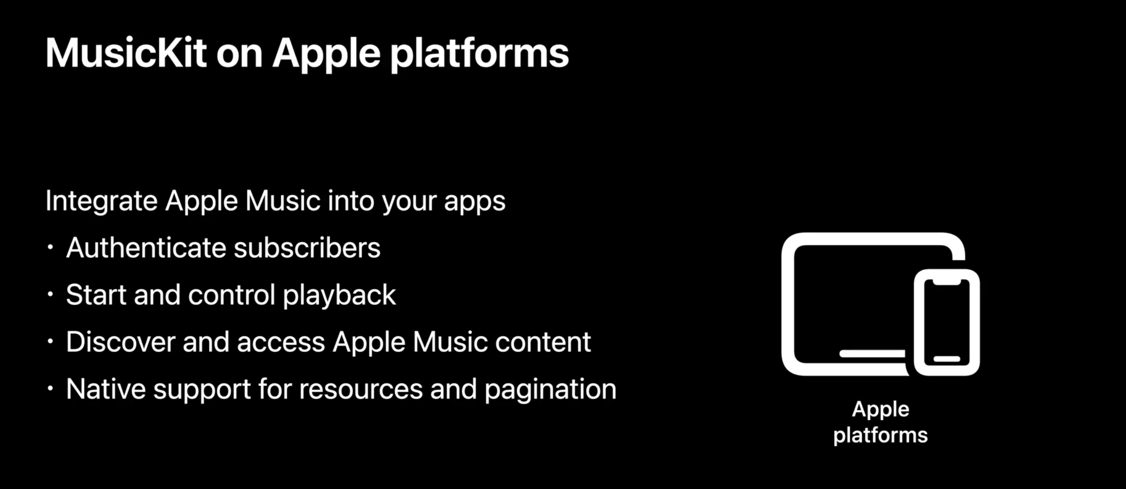 - MusicKit 클라이언트 프레임워크는 구독자를 인증하고 장치에서 재생을 시작 및 제어하는데 필요한 API를 제공합니다.