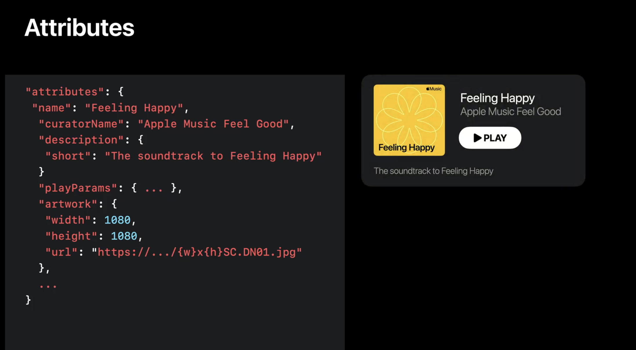 - 리소스는 아티스트, 앨범, 노래, 재생 목록 등과 같은 Apple Music 콘텐츠를 모델링합니다.
