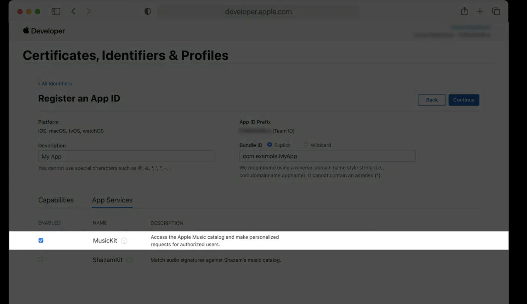 - Apple 플랫폼의 애플리케이션의 경우 앱에 MusicKit 서비스를 활성화하여 자동 토큰 관리를 활용할 수 잇습니다.
