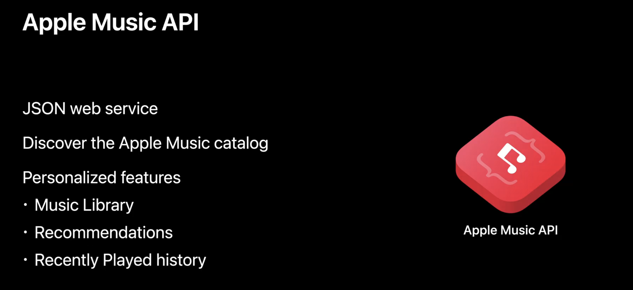 - Apple Music API는 검색 기능 및 Apple Music 카탈로그 콘텐츠에 필요한 액세슬르 제공하는 일반적인 JSON 웹 서비스 입니다.