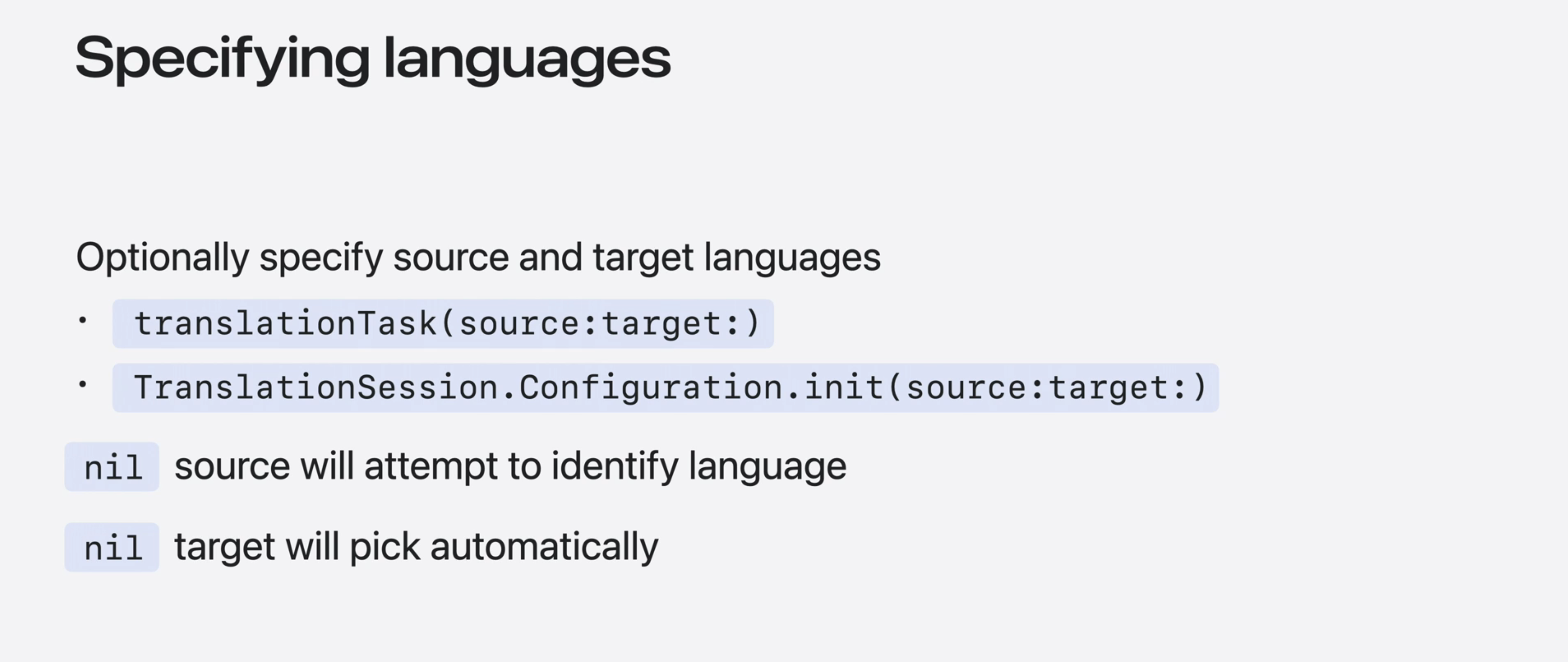 translationTask()에 직접 언어를 지정TranslationSession.Configuration에서 지정nil로 지정하면 콘텐츠 언어를 자동으로 식별nil로 지정하면 사용자의 기본 언어에 맞춰 자동 선택콘텐츠가 어떤 언어인지 아는 방법이 궁금할 겁니다.