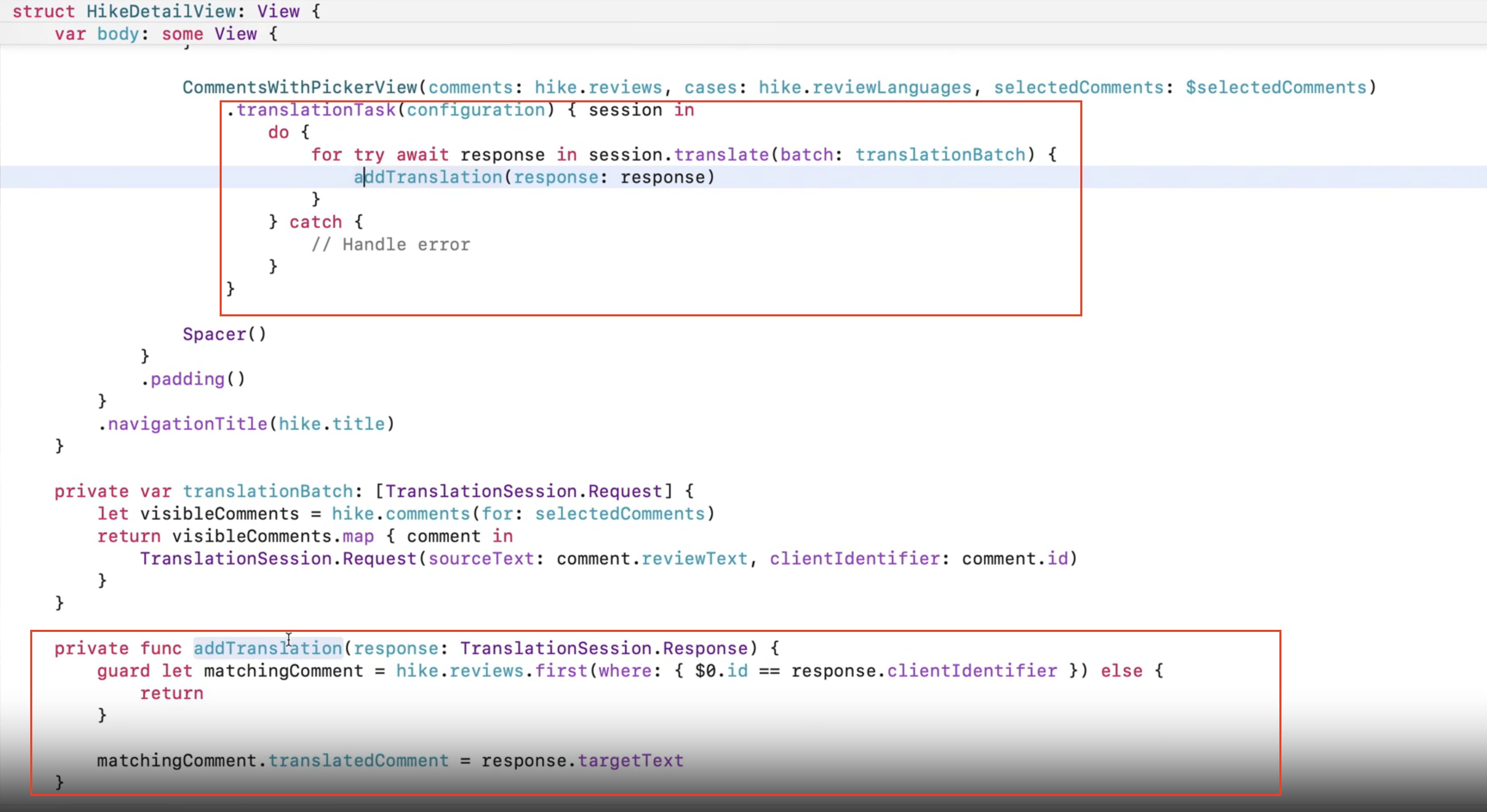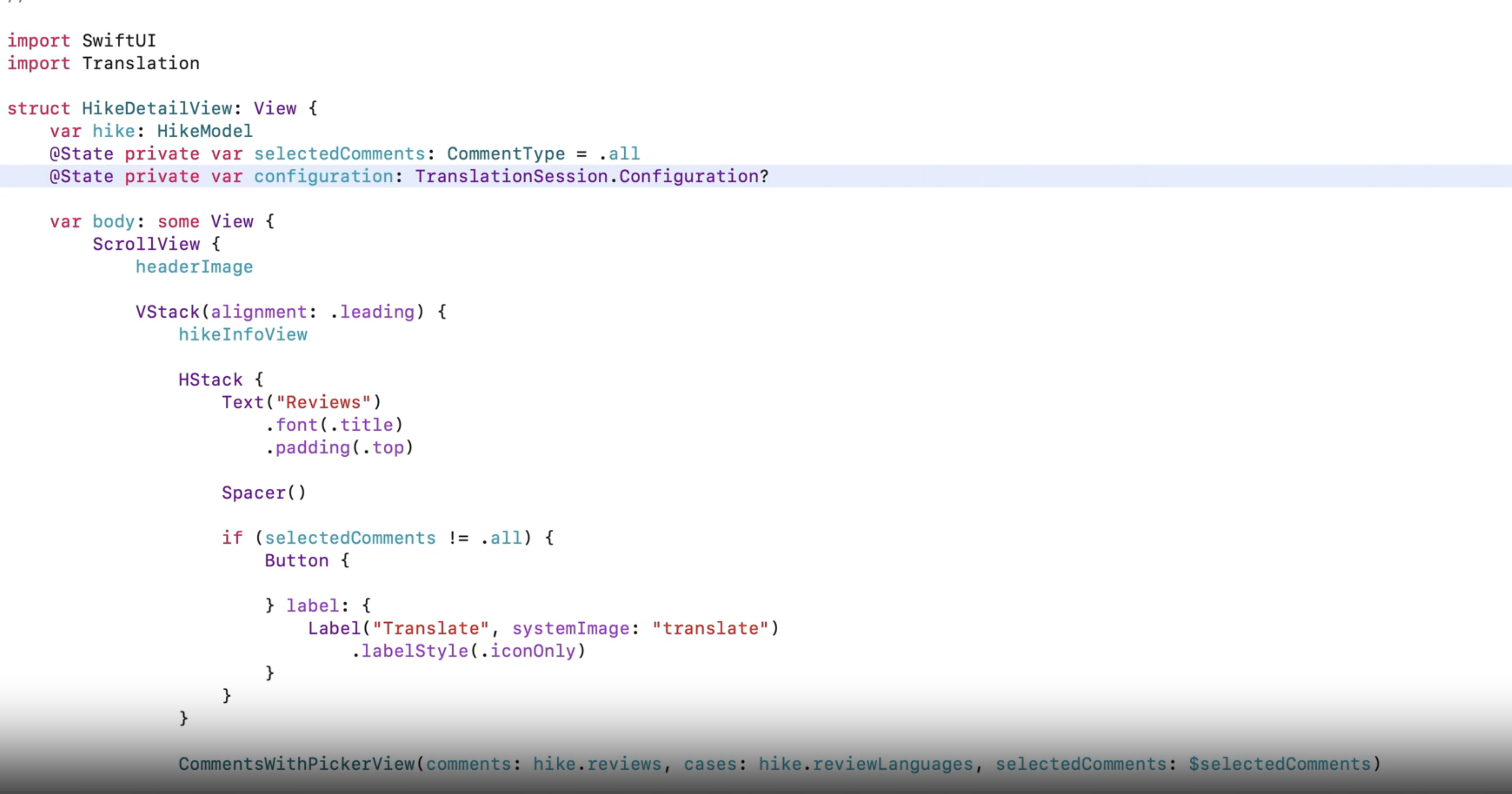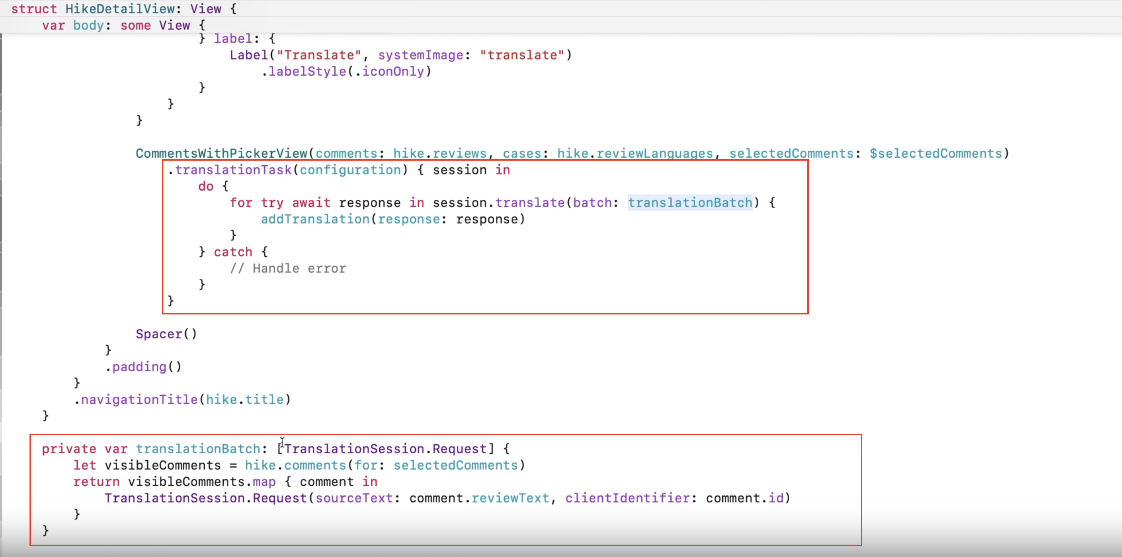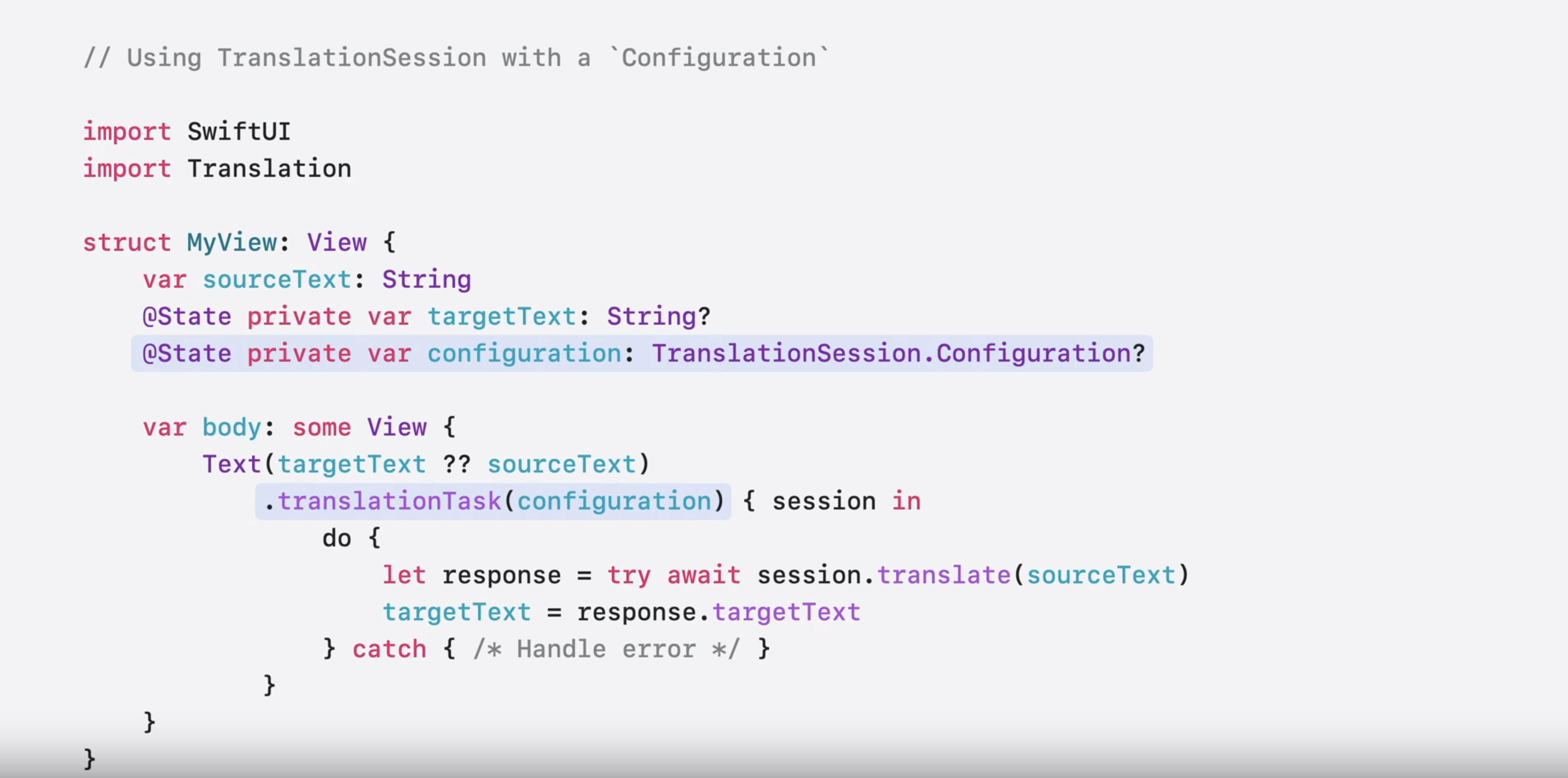 이제 이 클로저는 구성이 변경될 때마다 실행됩니다. 초기에 번역을 트리거하려면 nil이 아닌 값으로 구성해야 합니다. 번역을 다시 트리거해야 하면, 클로저를 다시 실행한다는 걸 SwiftUI가 알 수 있도록 구성을 변경해야 합니다.