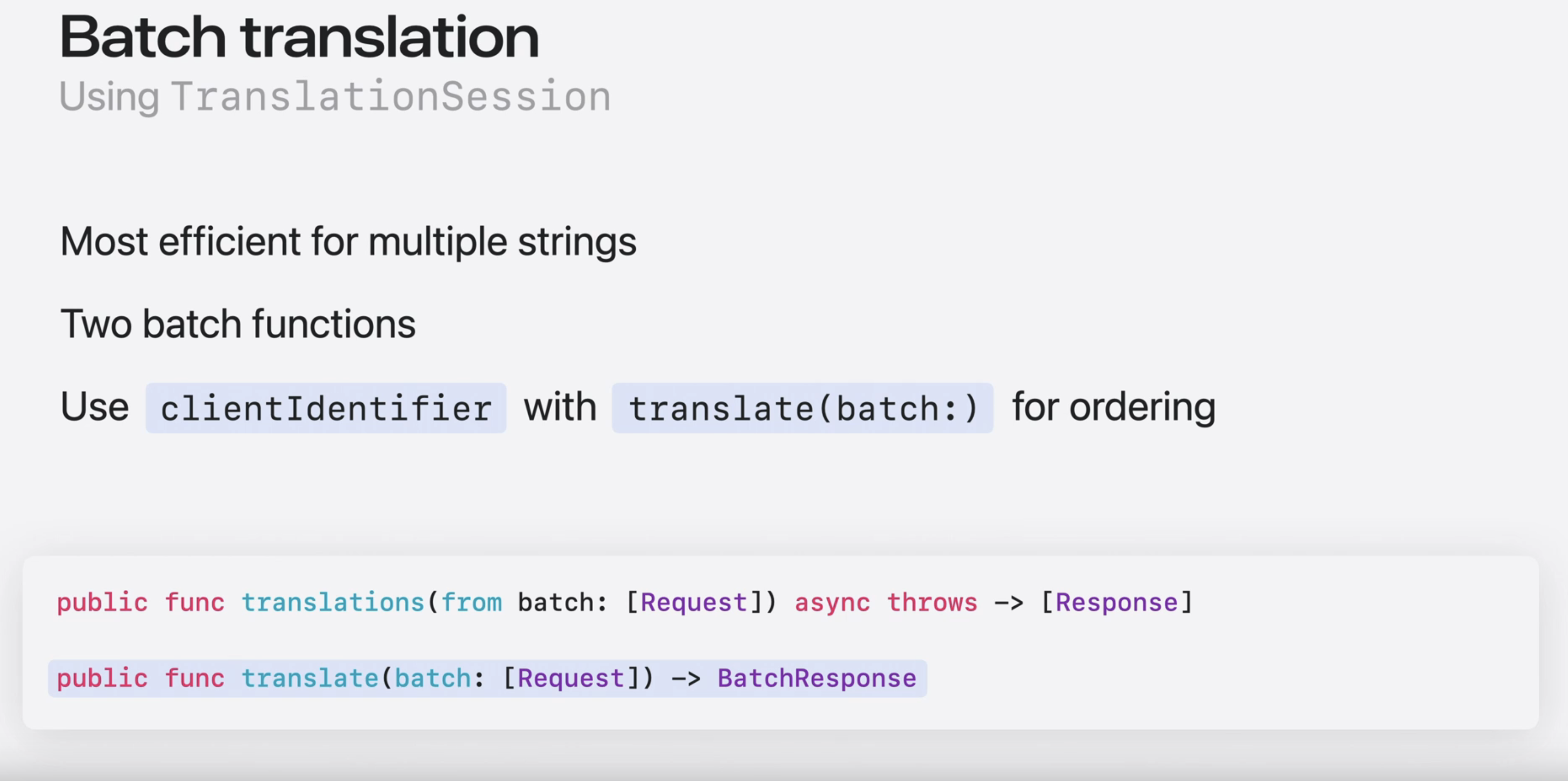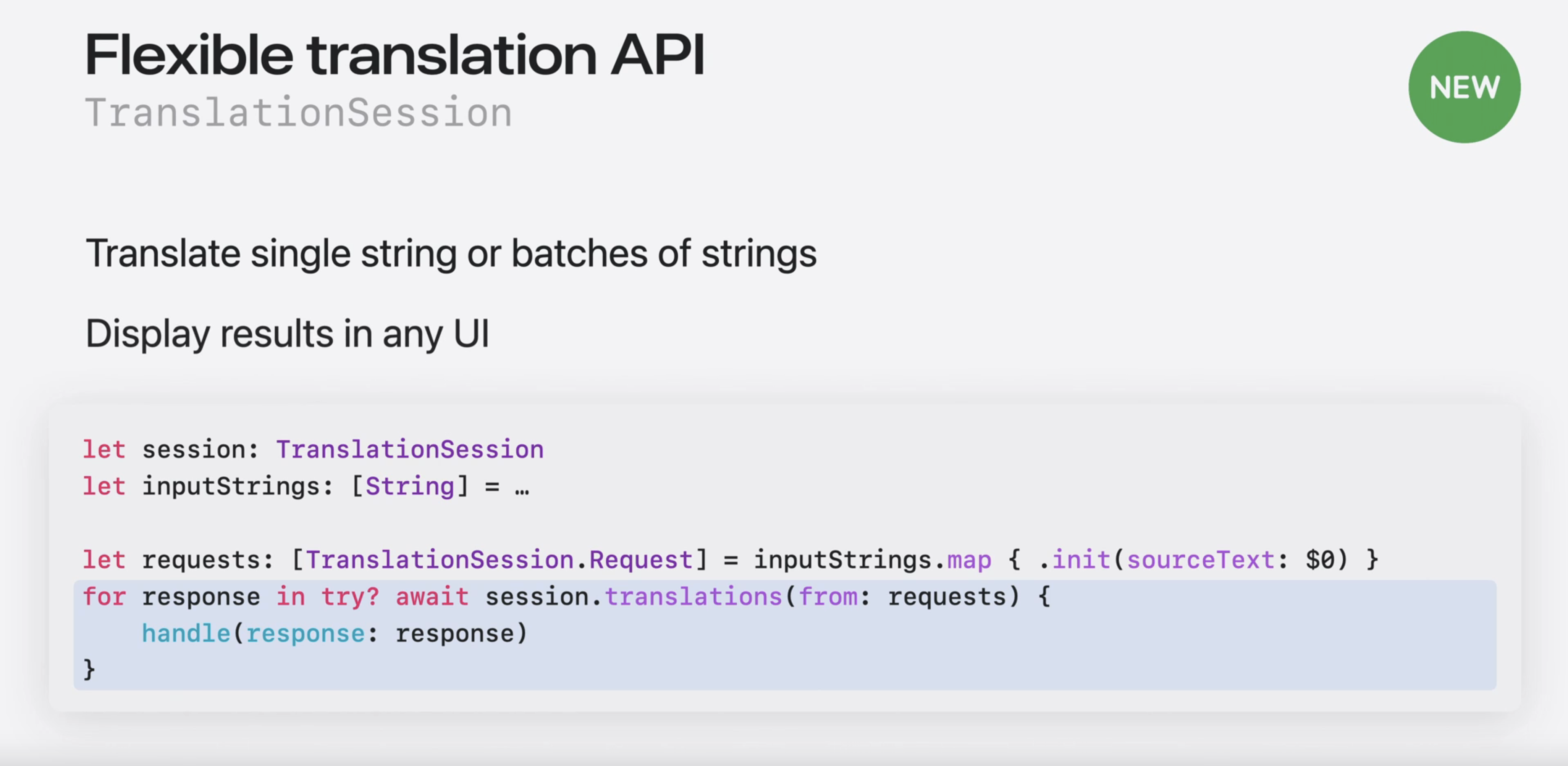 이 API의 핵심에는 TranslationSession 클래스가 있습니다. TranslationSession을 사용하면 여러 문자열을 동시에 번역하고, Swift의 비동기 구문을 통해 결과를 반환받을 수 있습니다.