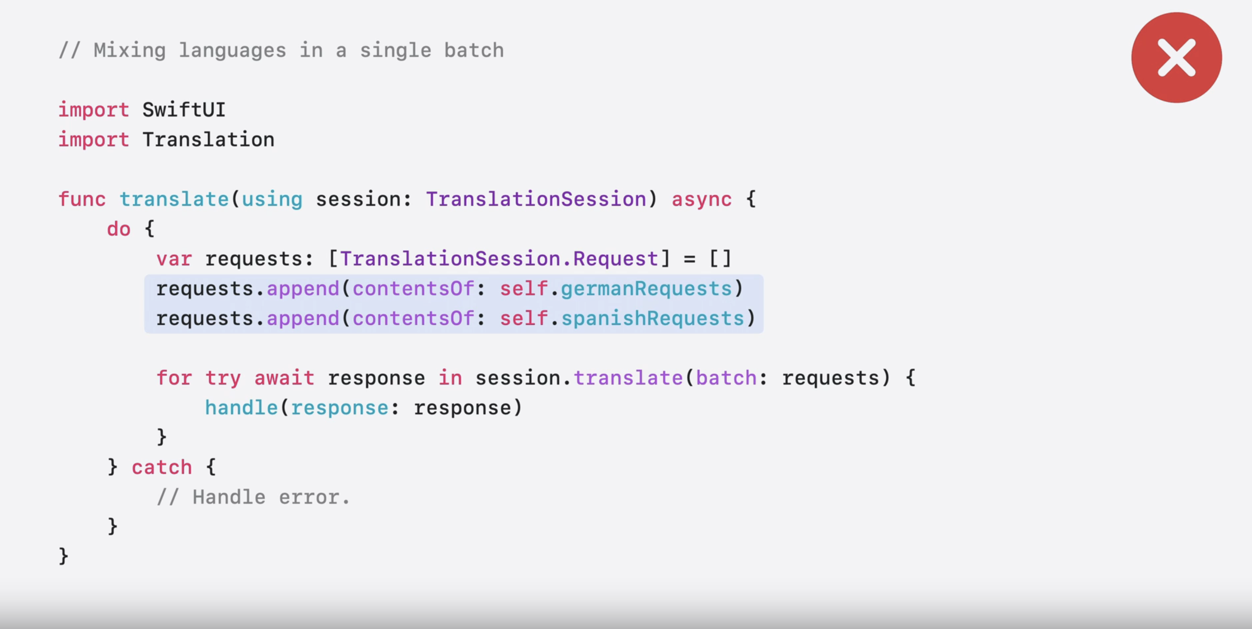 지원되지 않는 언어 쌍으로 TranslationSession을 만들 수는 있겠지만 번역을 시도할 때마다 오류가 반환될 것입니다