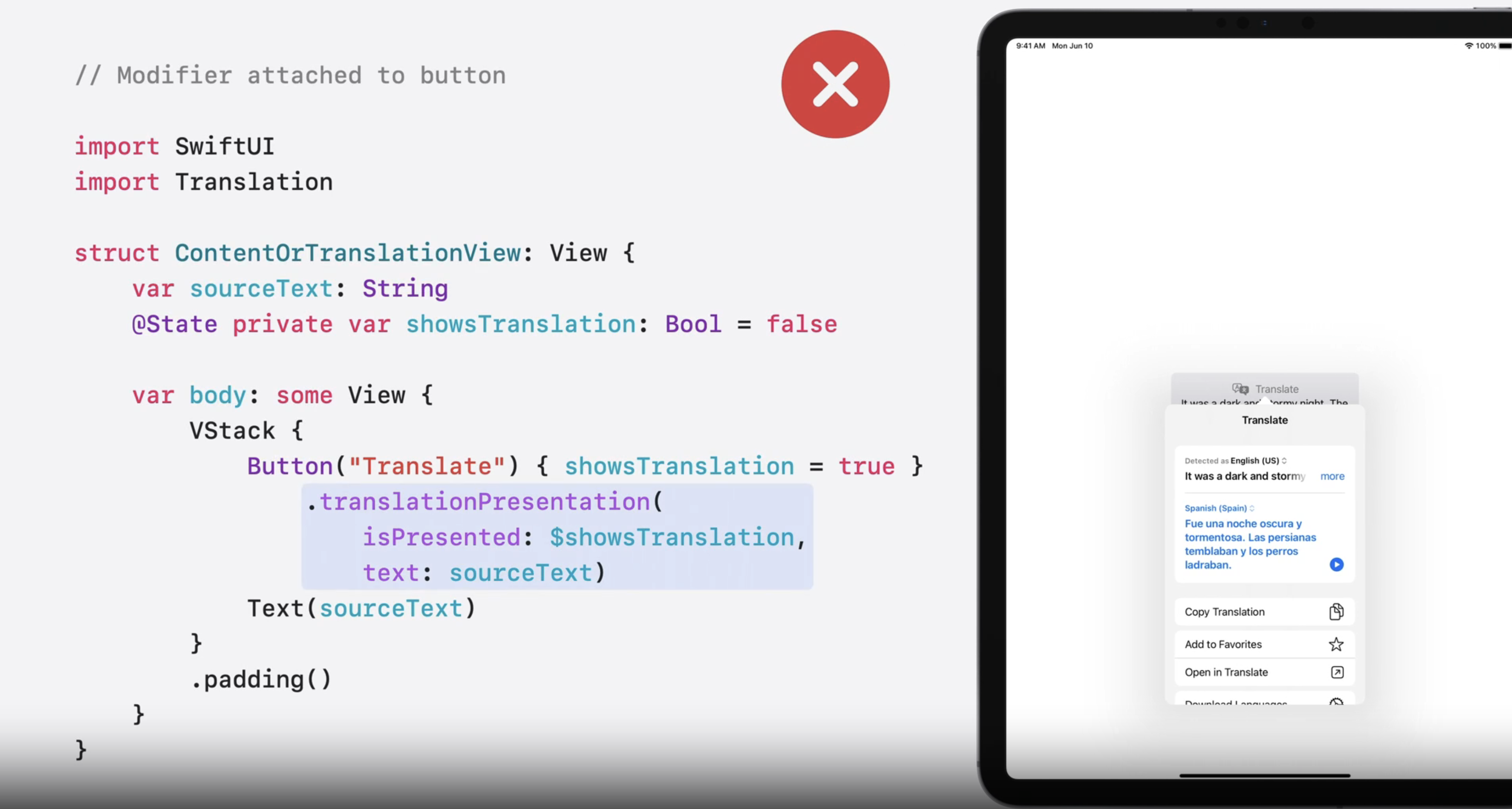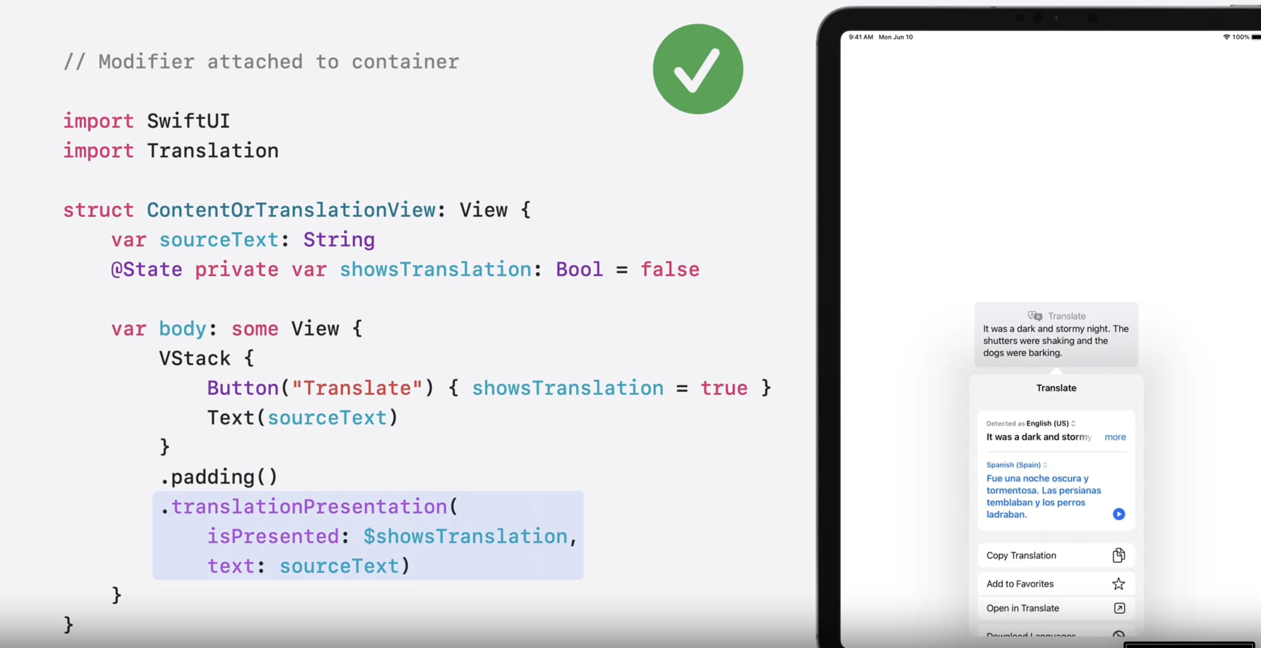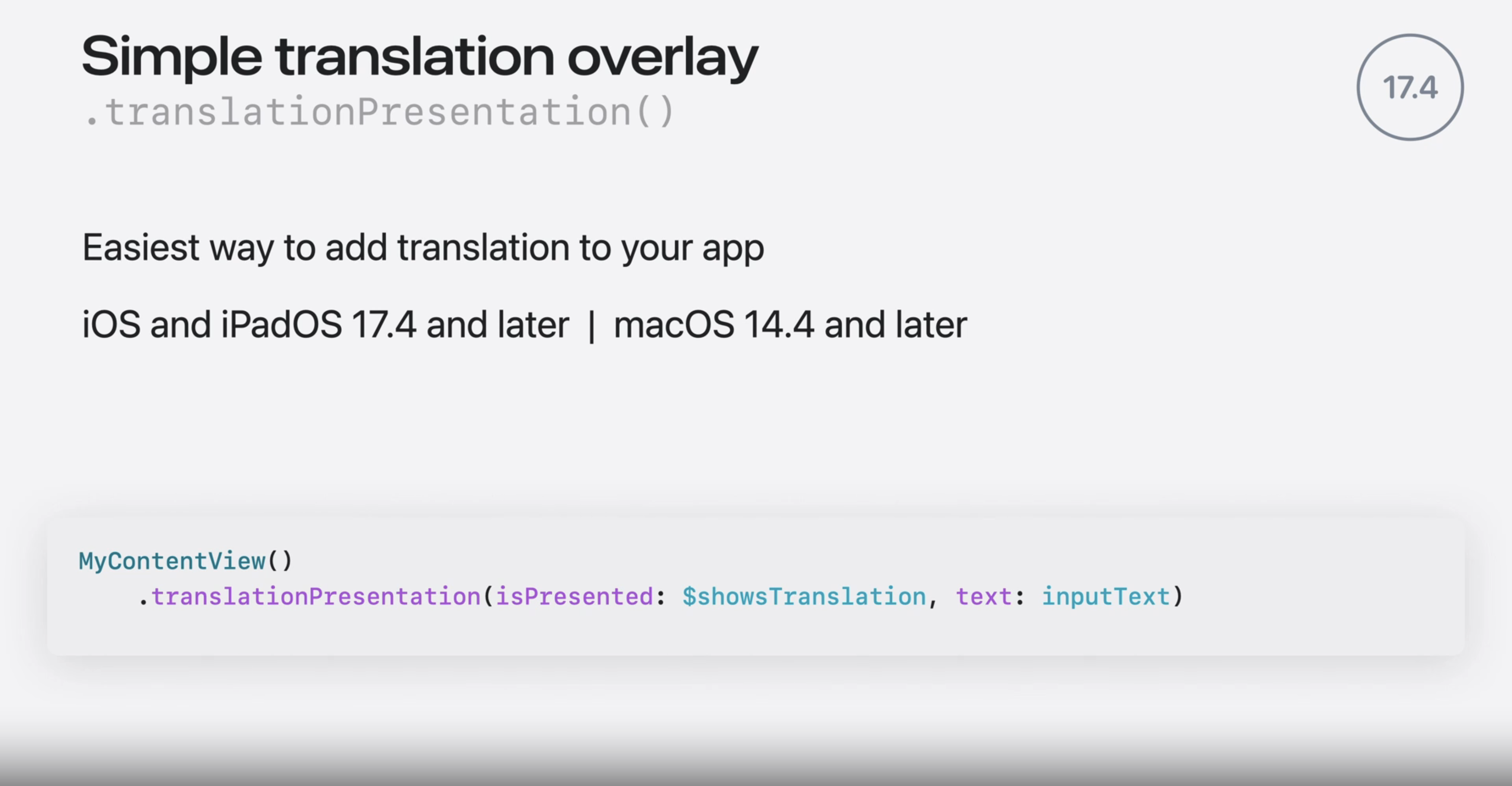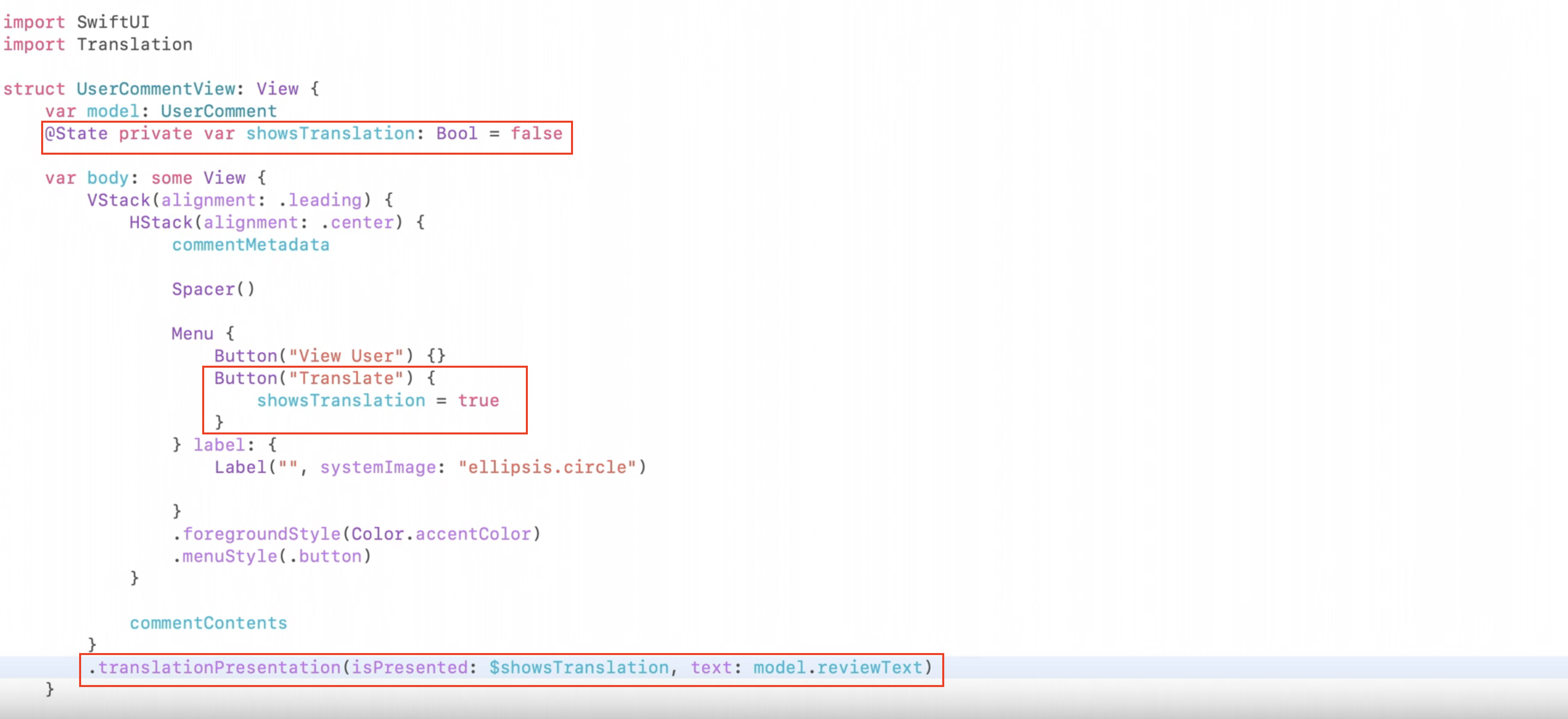 앱에 번역 기능을 쉽게 추가하려면 translationPresentation()을 사용할 수 있습니다.
